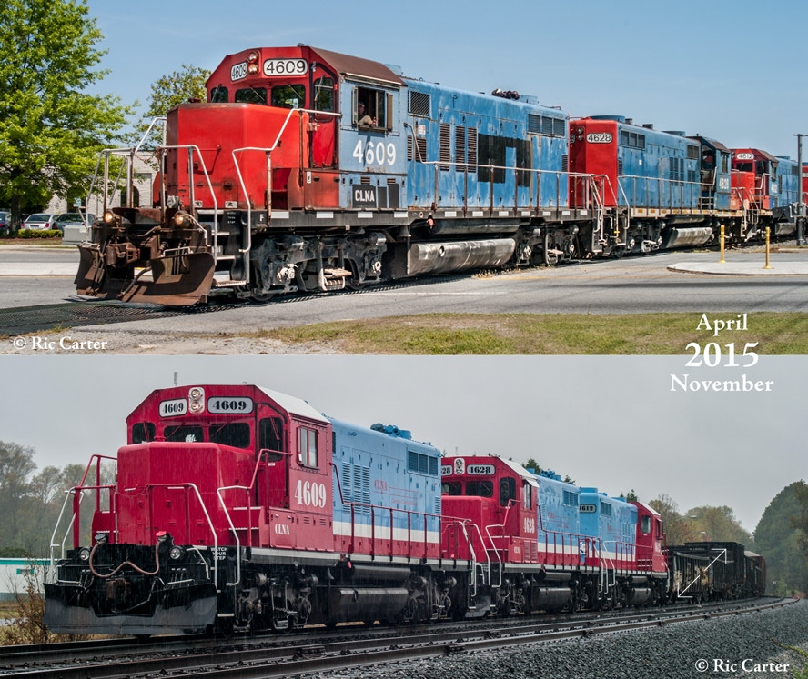 It’s hard to choose between old and new. A pretty as Carolina Coastal Railway’s paint scheme is, I still find myself missing the old raw color and rust of the original Grand Trunk and Canadian National livery they once flew. Here is a comparison of the same team before and after new paint jobs.The April shot is from Greenville and the November from Chocowinity.