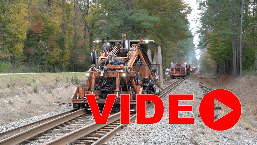The R3 Dual Rail Gang is the only such rail replacement crew operating- they replace both rails at the same time. After the old rail has been slid to the outside of the ties, the Sergeant (SGT-Standard Gauge Threader) rides the old rail as it slides the new ribbon from the inside of the ties to its proper position atop the plates. The following units will heat the rail, and tack it down with spikes. Rube Goldberg would be proud of this one-of-a-kind mechanical wonder.