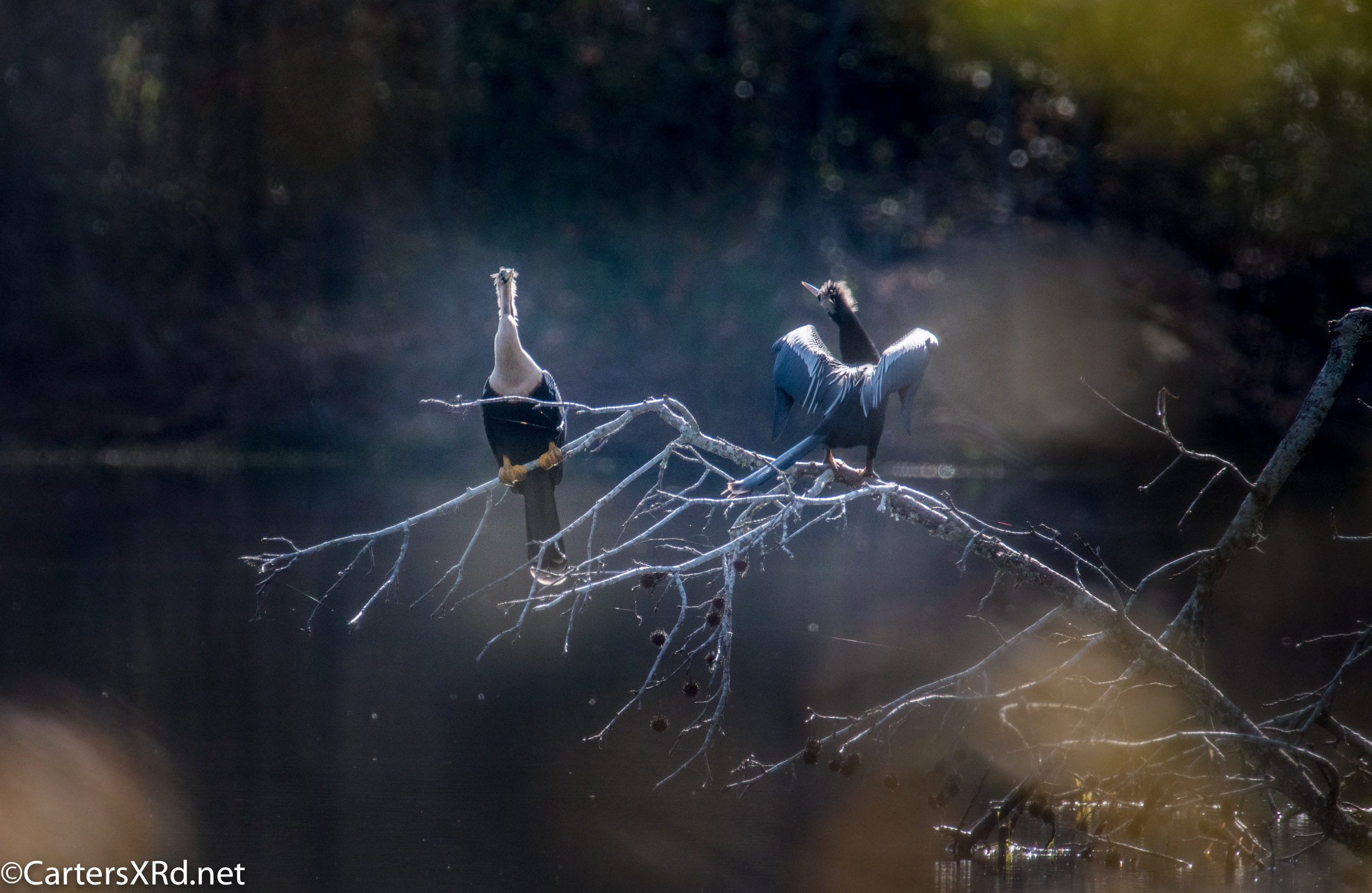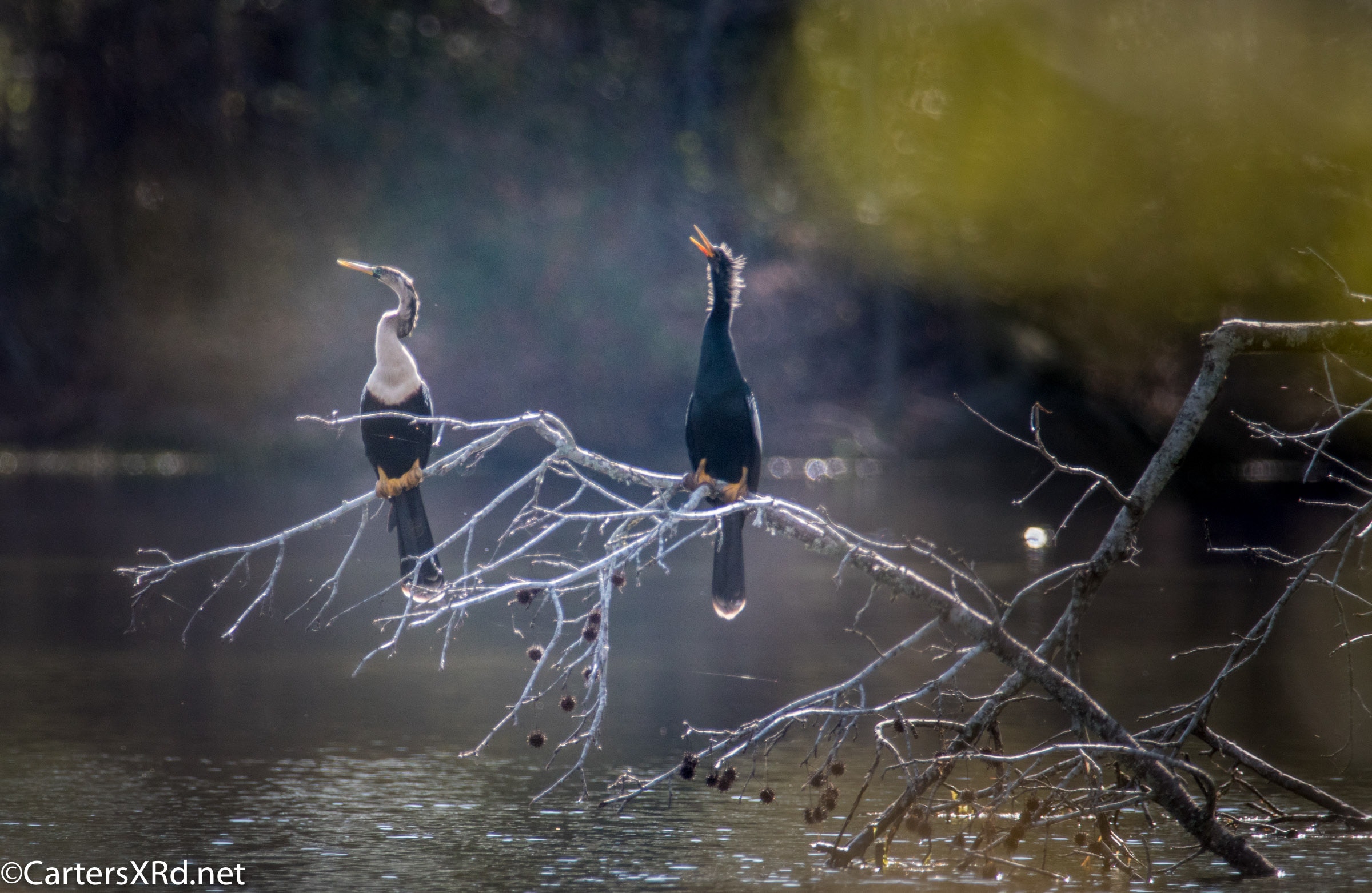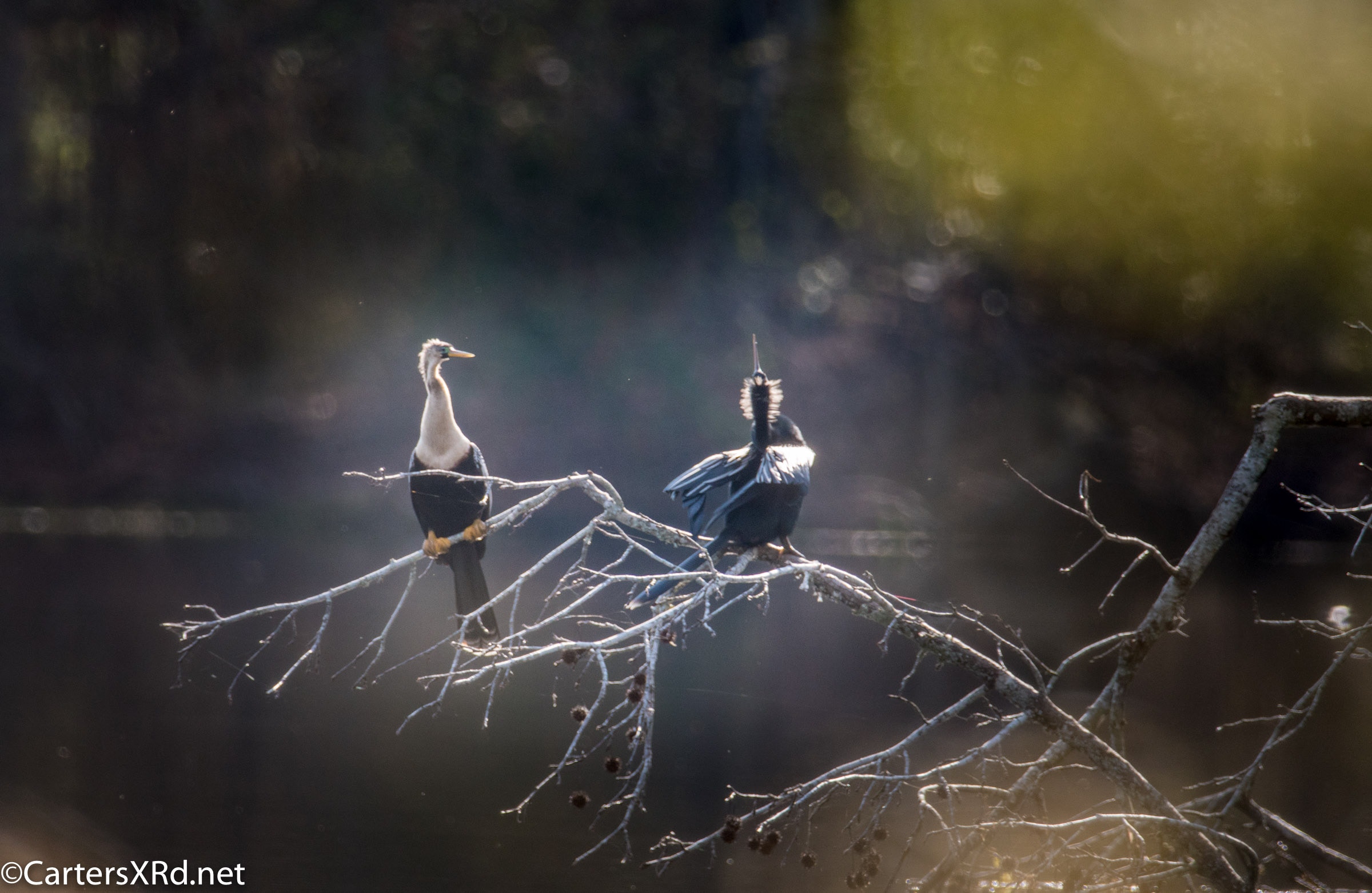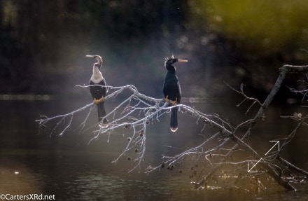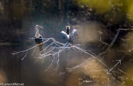 Ah springtime! When hopes and goals soar. When the heart turns to romance. These anhingas in an old Beaufort County sandpit were thinking about preservation of the species. The persuasive abilities of the male on the right are unverified as the female did not immediately follow him after his display.