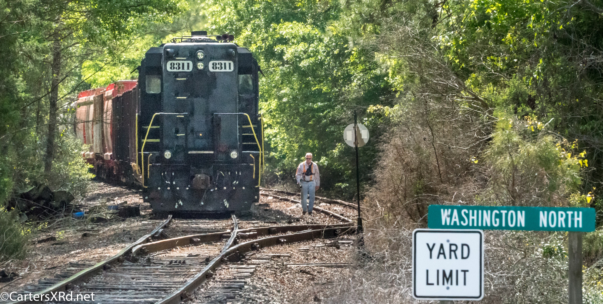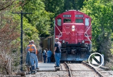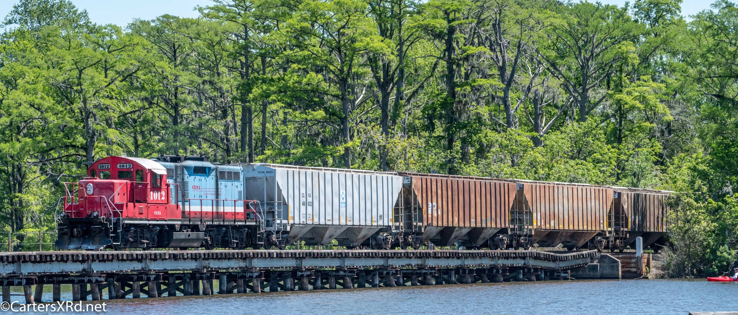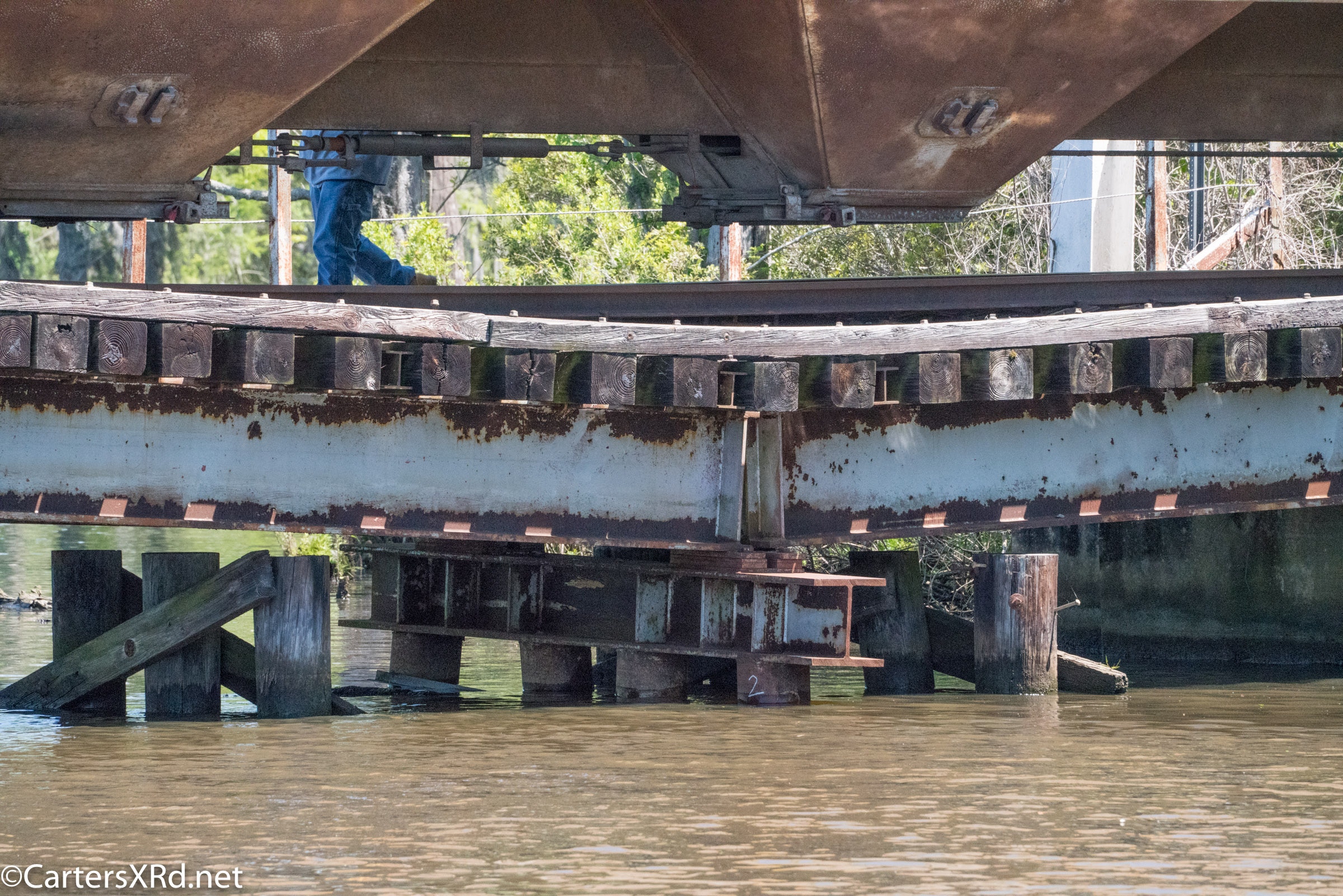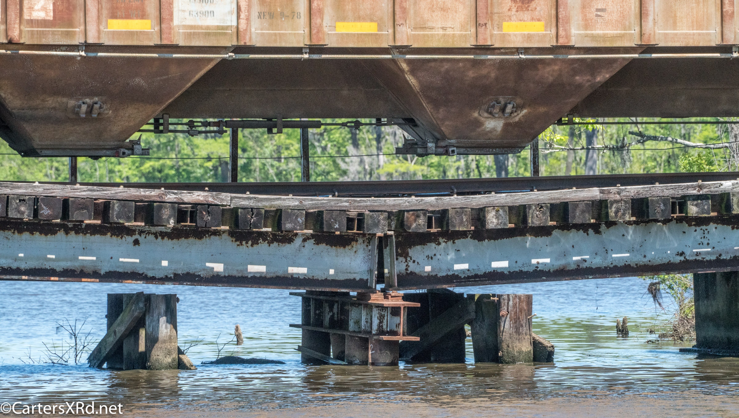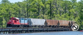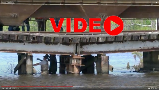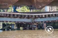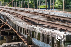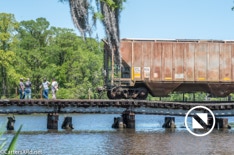 On April 22, the rail trestle across Runyan Creek between Washington Park and Washington NC failed. It was a close call for the locomotive and crew as the south track fell by a foot or more. The Carolina Coastal Railway engineer did a great job of stopping the train and getting a car astraddle the broken span. to minimize the weight on the bad section. Here are a couple of dozen stills and a video of the event clean-up.