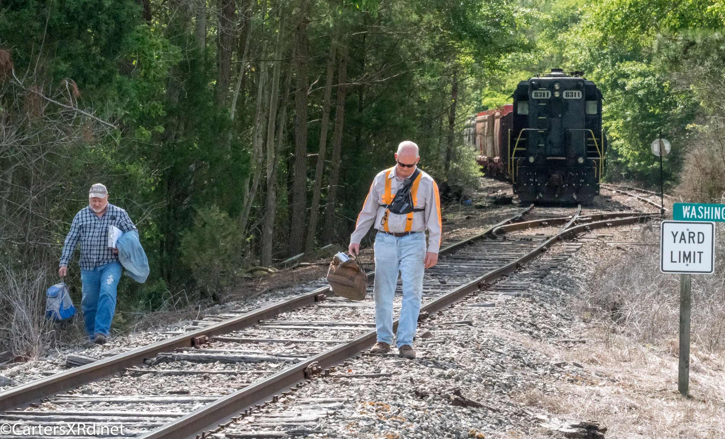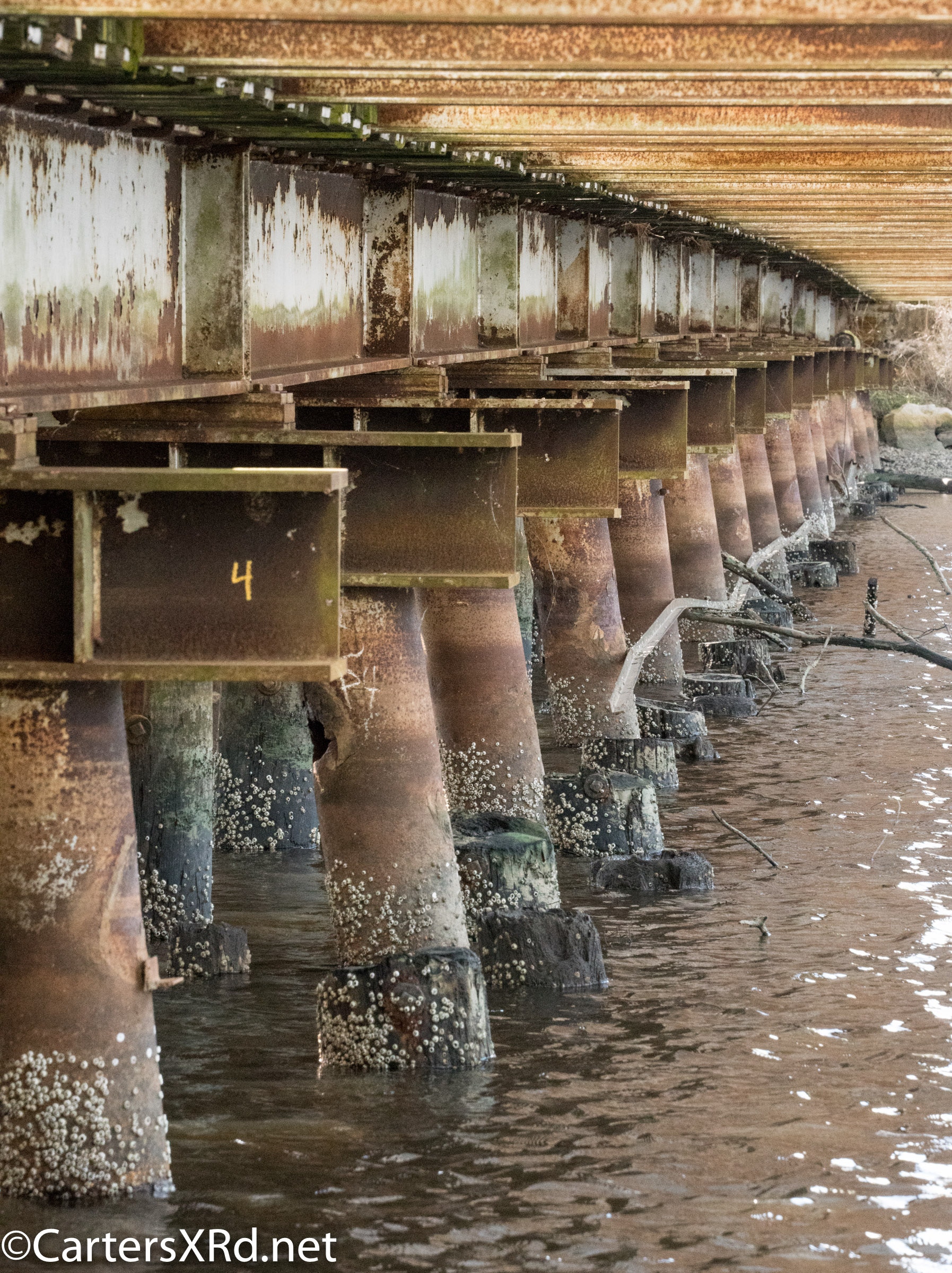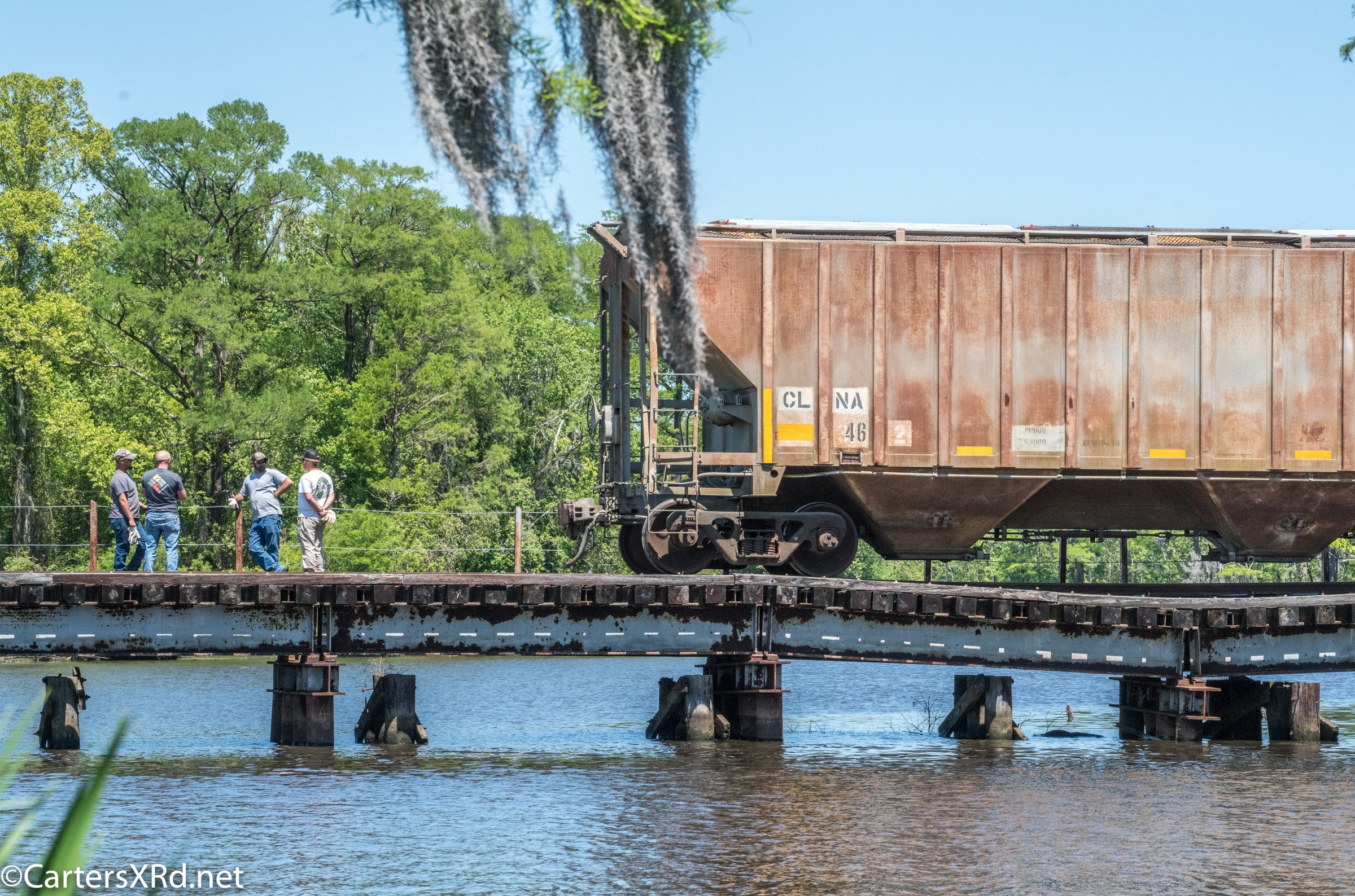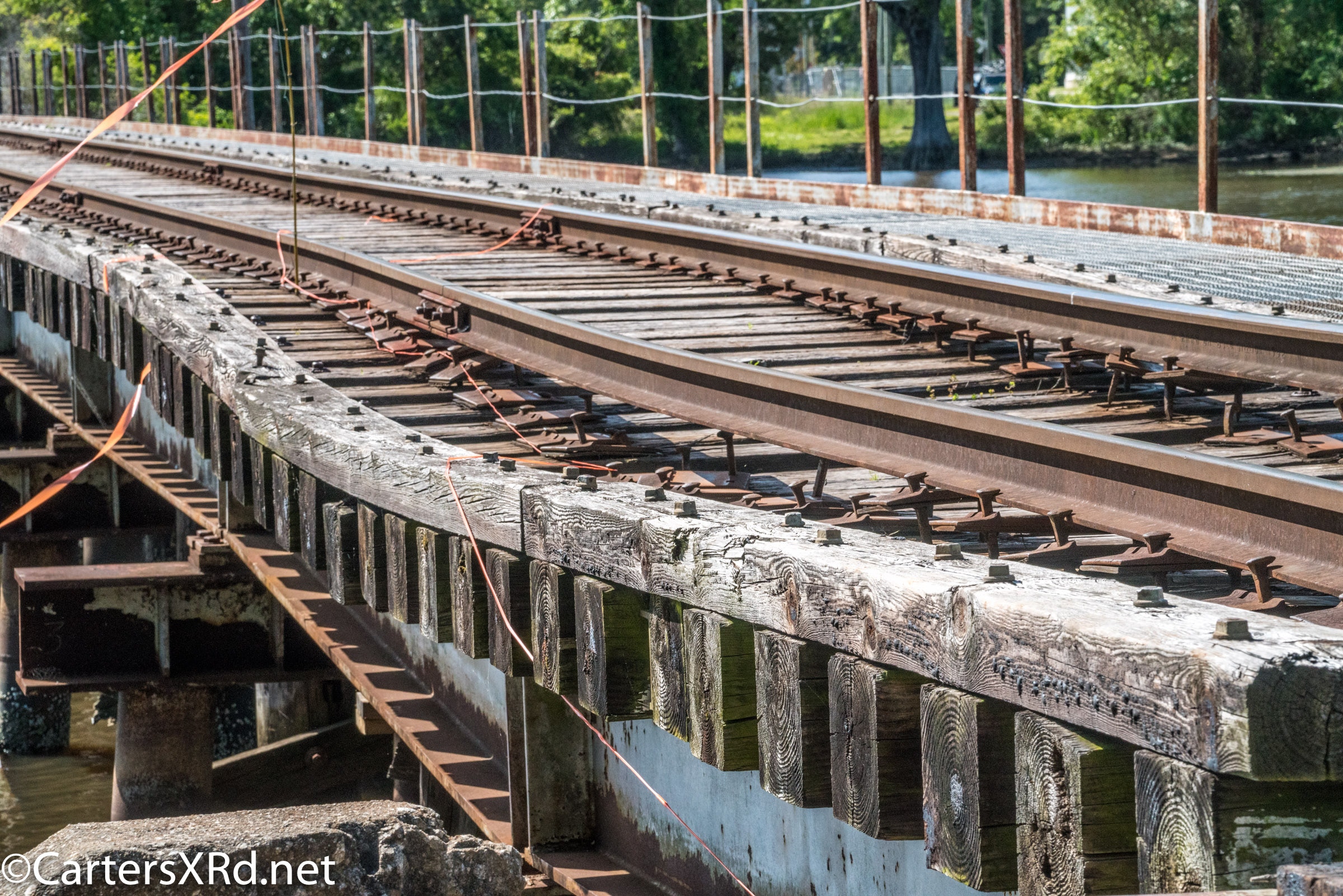 On April 22, the rail trestle across Runyan Creek between Washington Park and Washington NC failed. It was a close call for the locomotive and crew as the south track fell by a foot or more. The Carolina Coastal Railway engineer did a great job of stopping the train and getting a car astraddle the broken span. to minimize the weight on the bad section. Here are a couple of dozen stills and a video of the event clean-up.