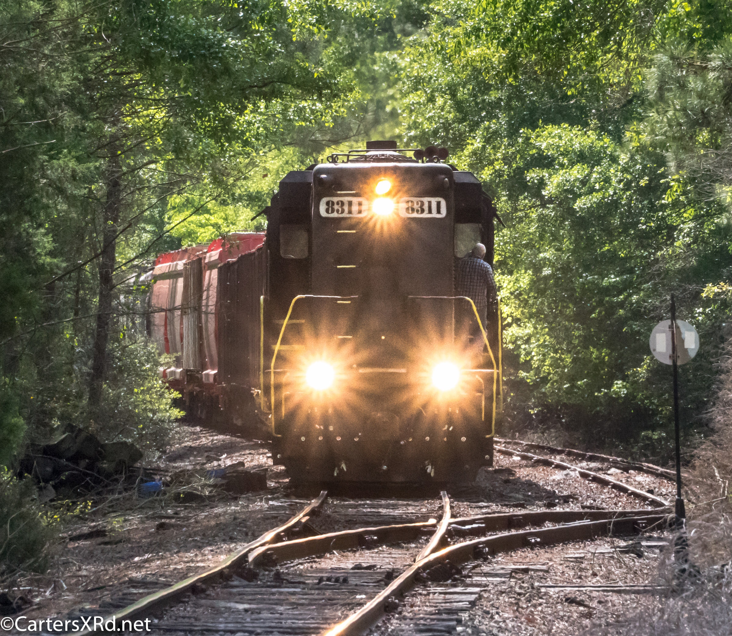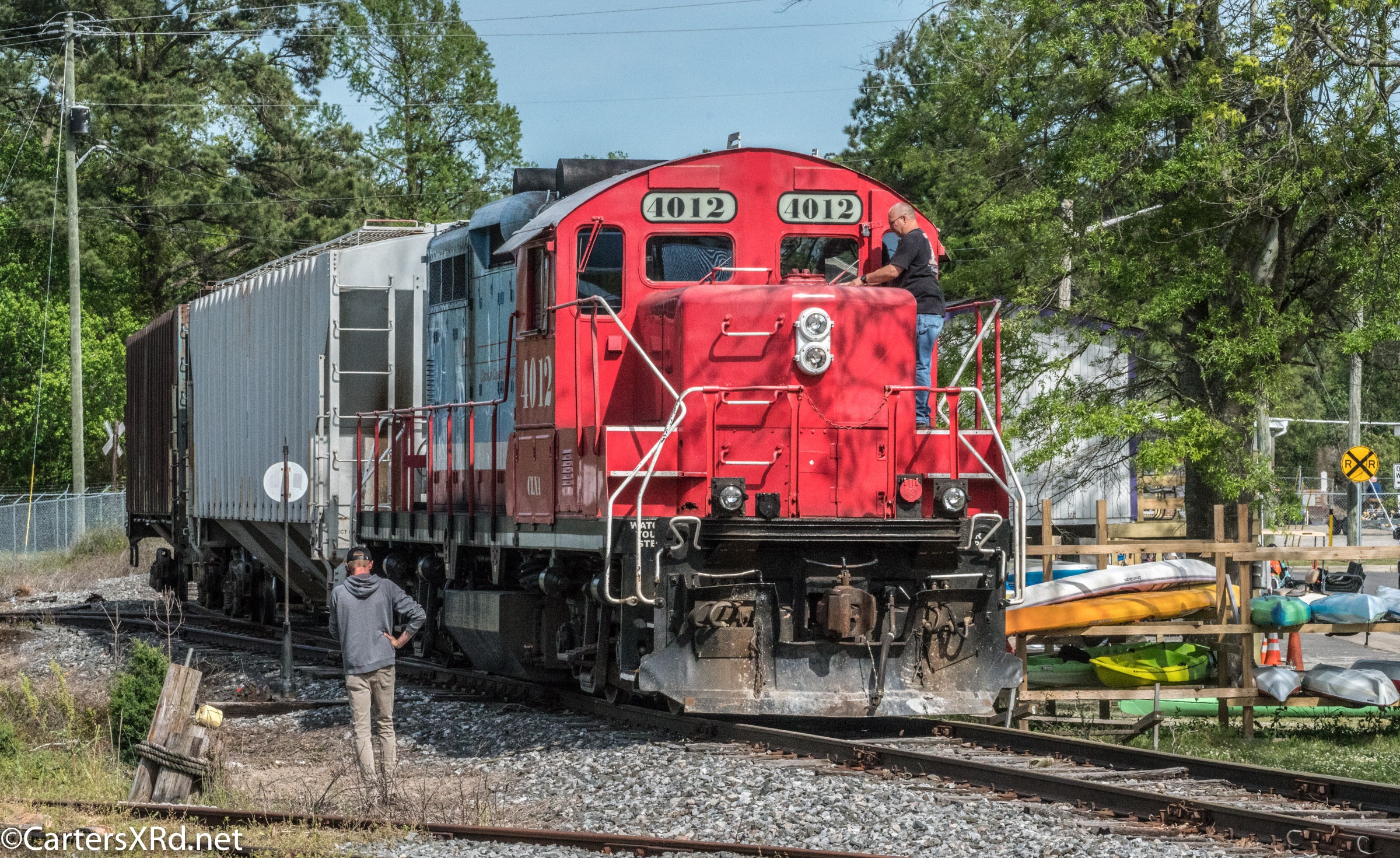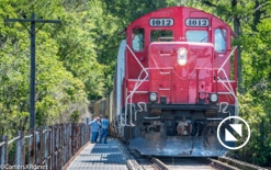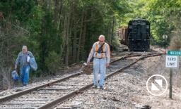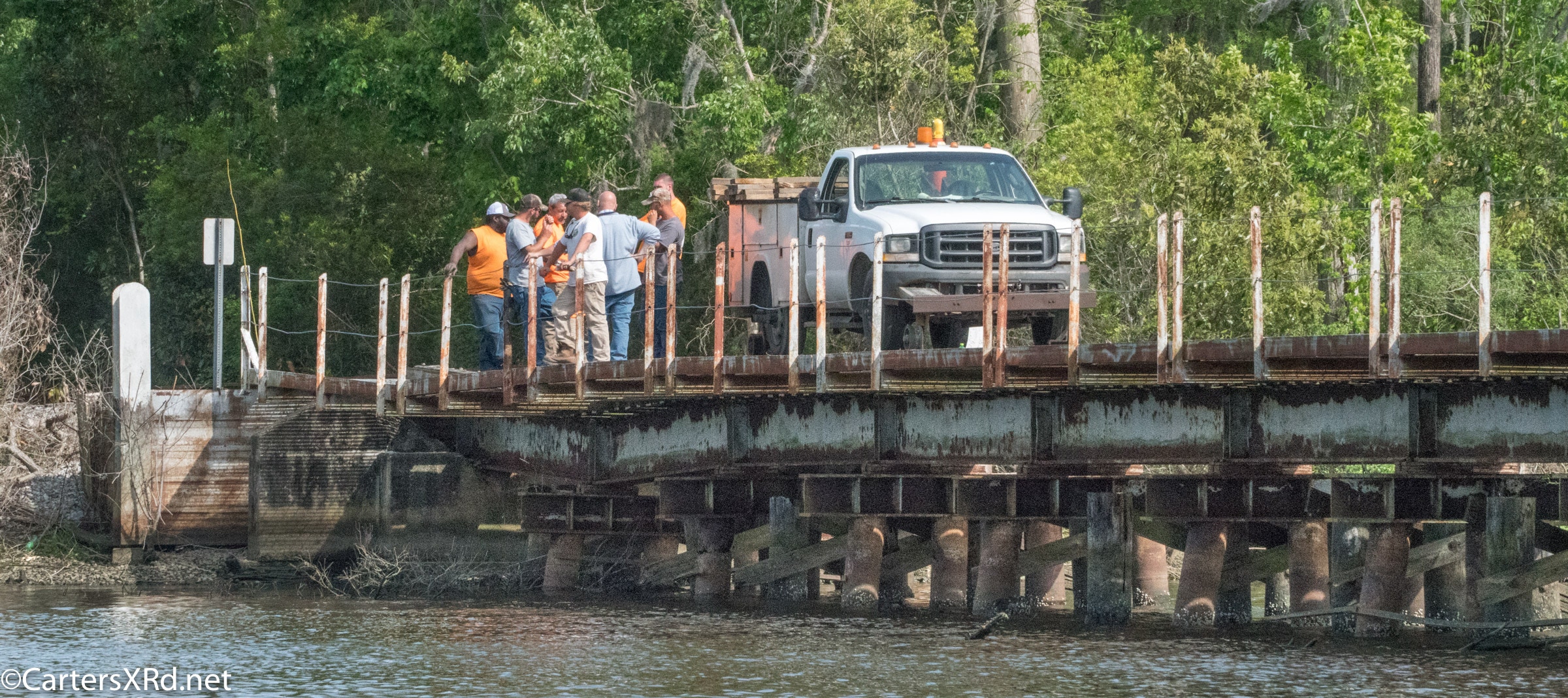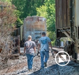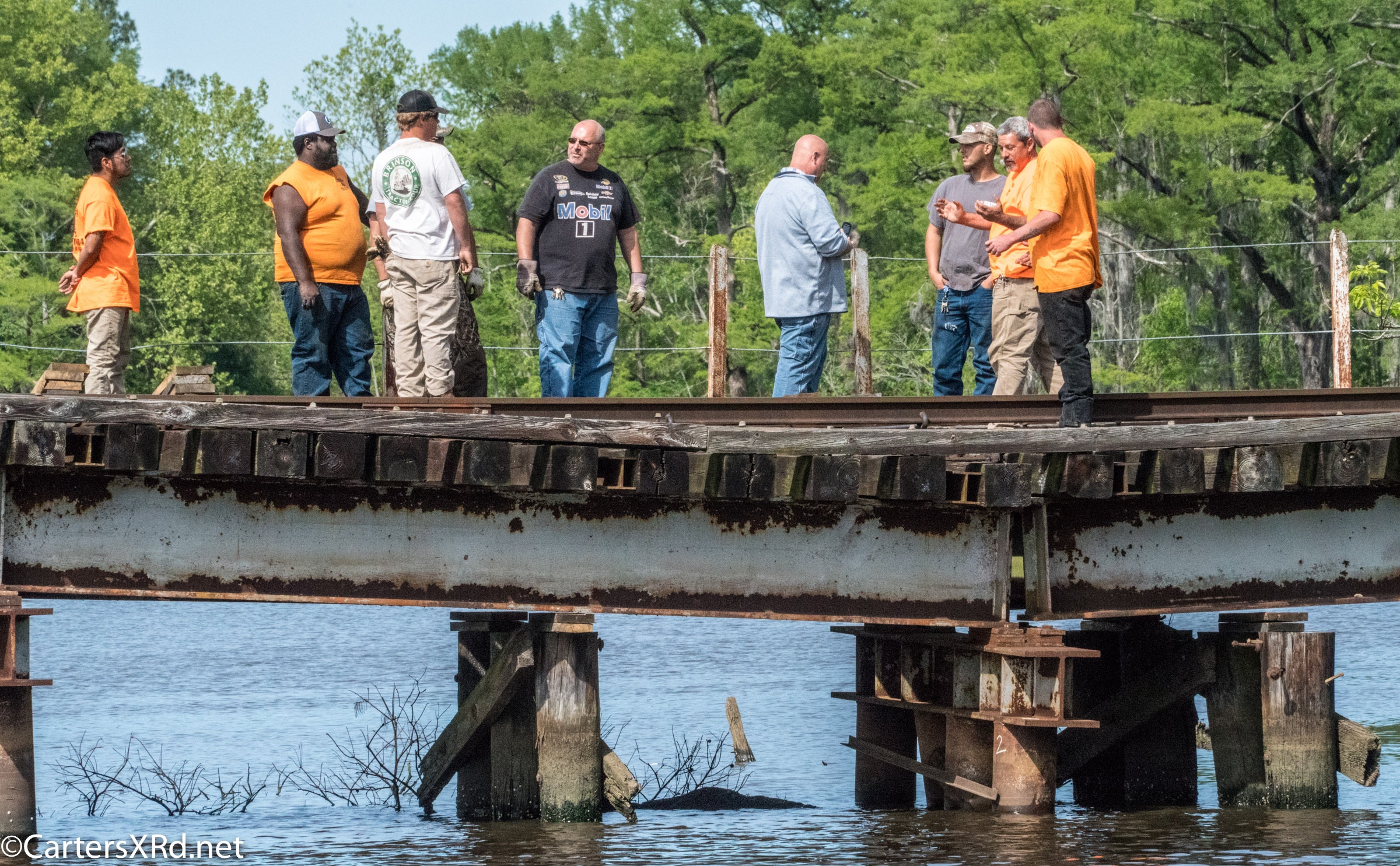 On April 22, the rail trestle across Runyan Creek between Washington Park and Washington NC failed. It was a close call for the locomotive and crew as the south track fell by a foot or more. The Carolina Coastal Railway engineer did a great job of stopping the train and getting a car astraddle the broken span. to minimize the weight on the bad section. Here are a couple of dozen stills and a video of the event clean-up.