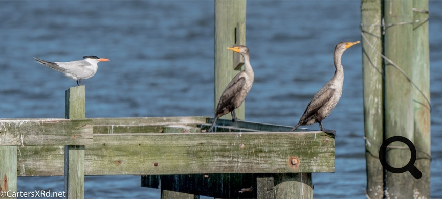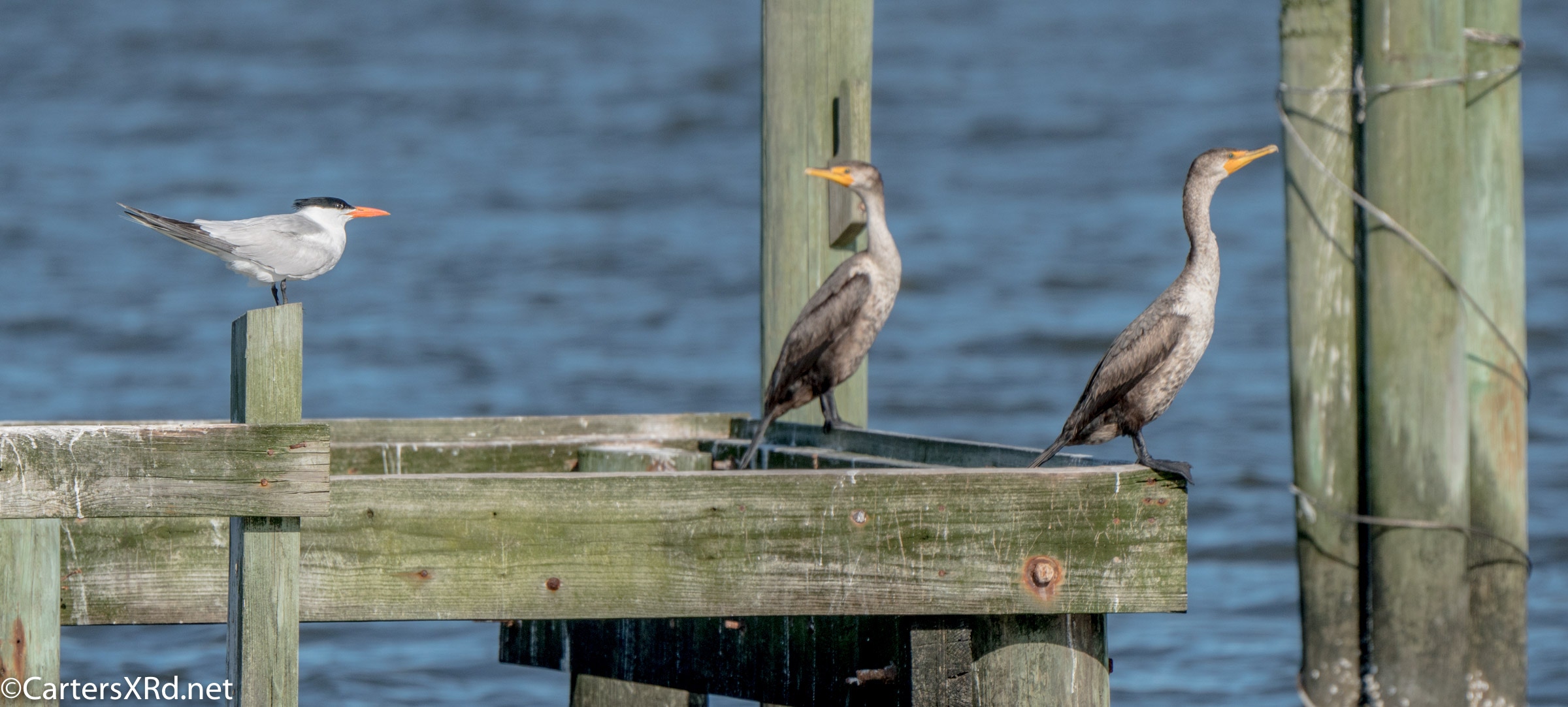 Royal/Caspian (?) Tern, Double-Crested Cormorants, South Creek NC