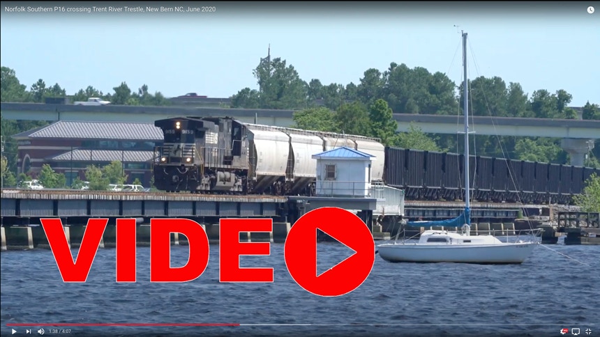 Norfolk Southern’s P16 freight runs from New Bern to Morehead City daily. Here it is June 3 crossing the Trent River trestle.