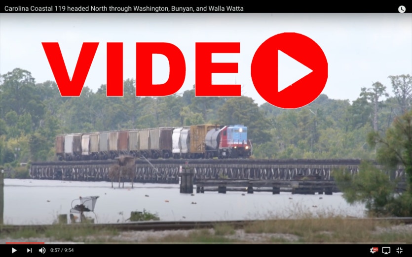 In another blast from the (not too distant) past, Carolina Coastal 120 is seen heading back to Pinetown. It’s seen here crossing the Pamlico River Trestle in Washington NC, passing through Bunyan and Walla Watta. It was shot August 5, 2019.