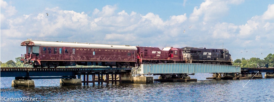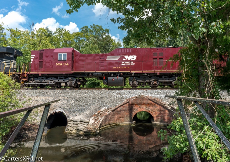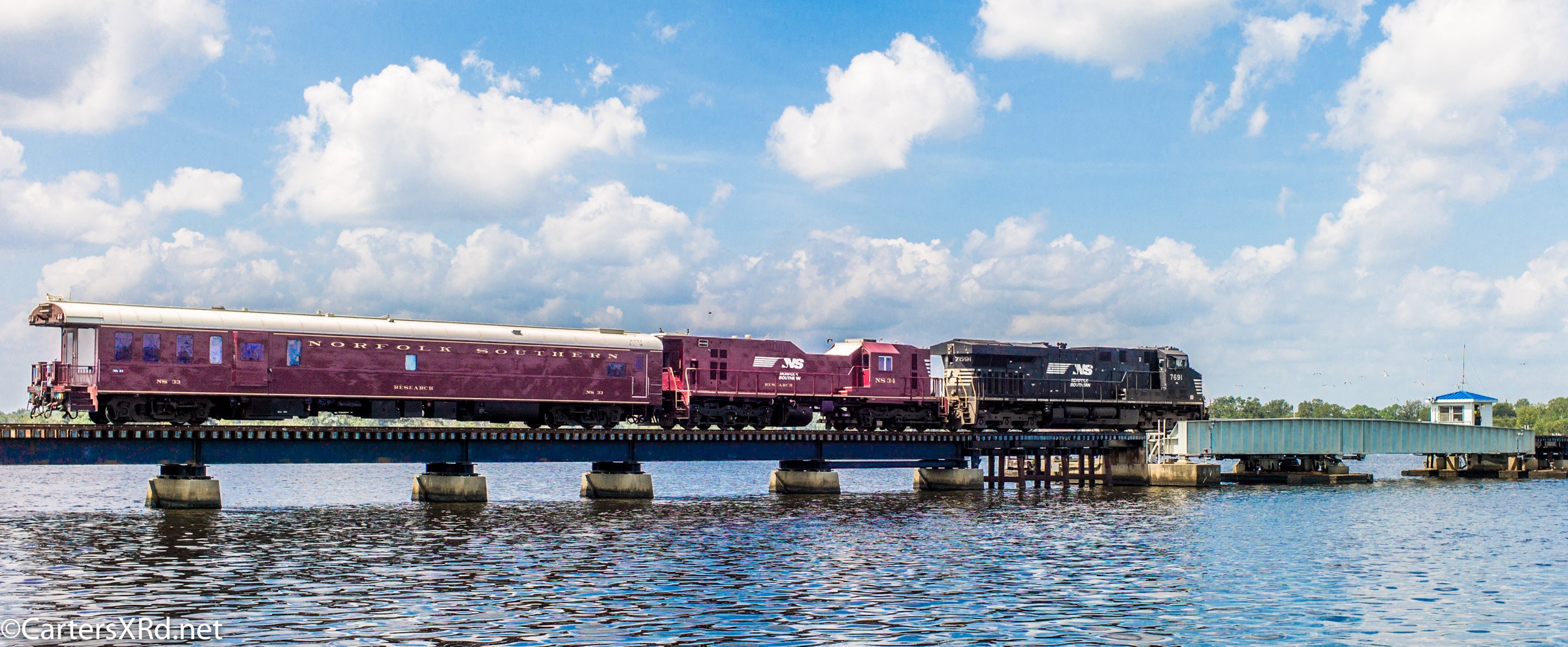 The Brick is a Norfolk Southern geometry train. Research Unit 33 and 34 contain instrumentation to track and record any track defects and their exact position. It made a run from Selma to Morehead City on September 3. Is is seen here on its return trip through New Bern. The track they ran is now being renewed.