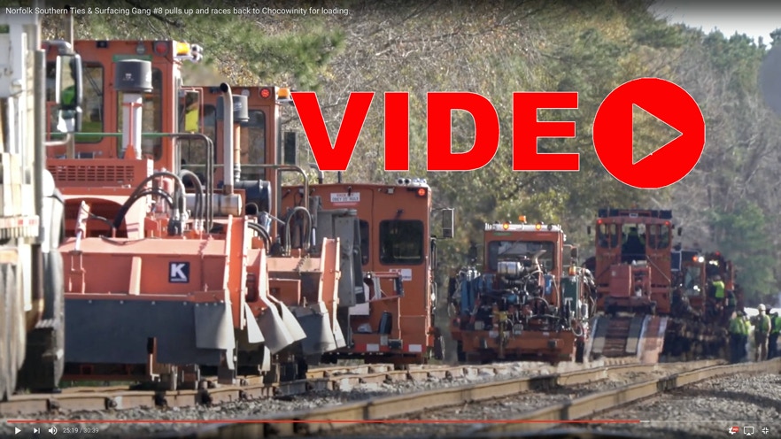 Norfolk Southern’s Tie and Surfacing Gang #8 have just finished up the WL line between Chocowinity and Aurora. On December 3 they waited for P90 to clear to the phosphate mine and dashed for Chocowinity to load up. Here’s the unit parade through Stilley Station and load-up in Marsden Yard.