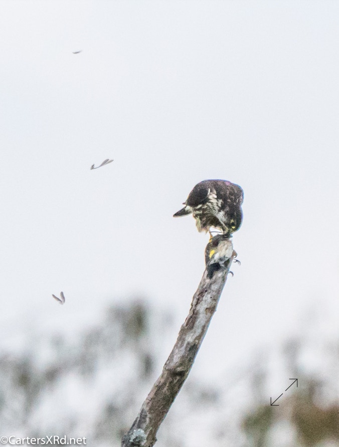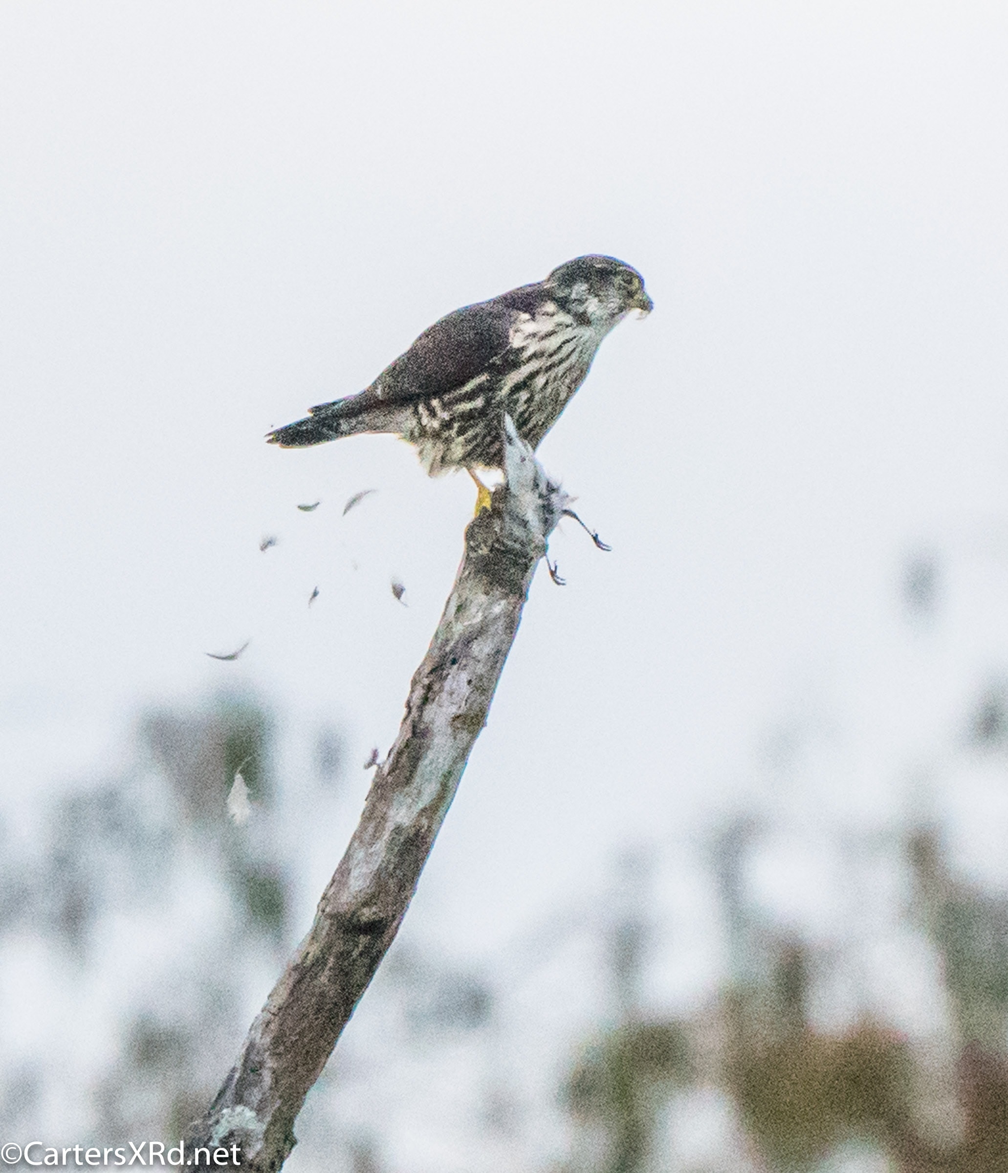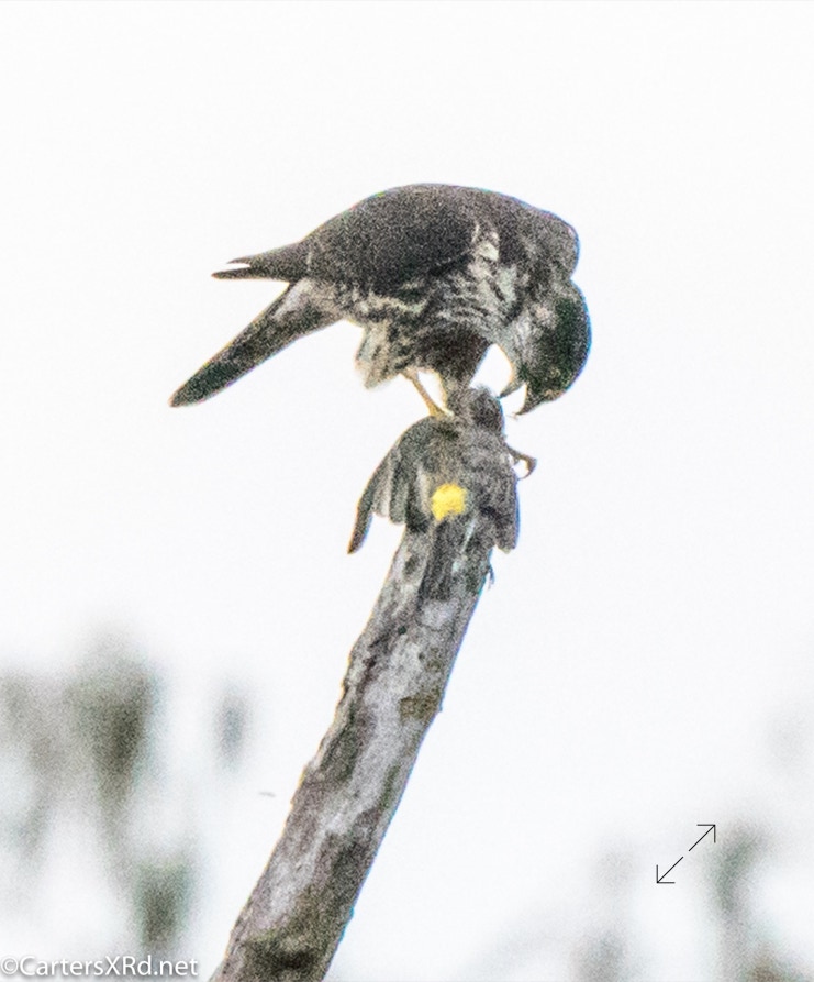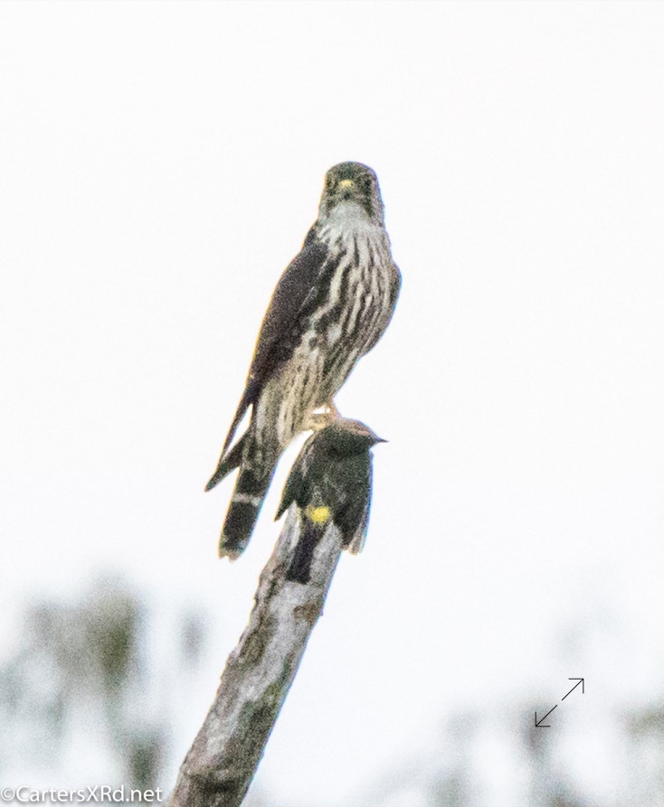 This merlin grabbed a yellow-rumped warbler over the creek on October 30. Kitty saw him veer of his path to grab the startled warbler. It was one of our more uncommon visitors thinning the numbers of one of our most common winter visitors. He was NOT wasteful.