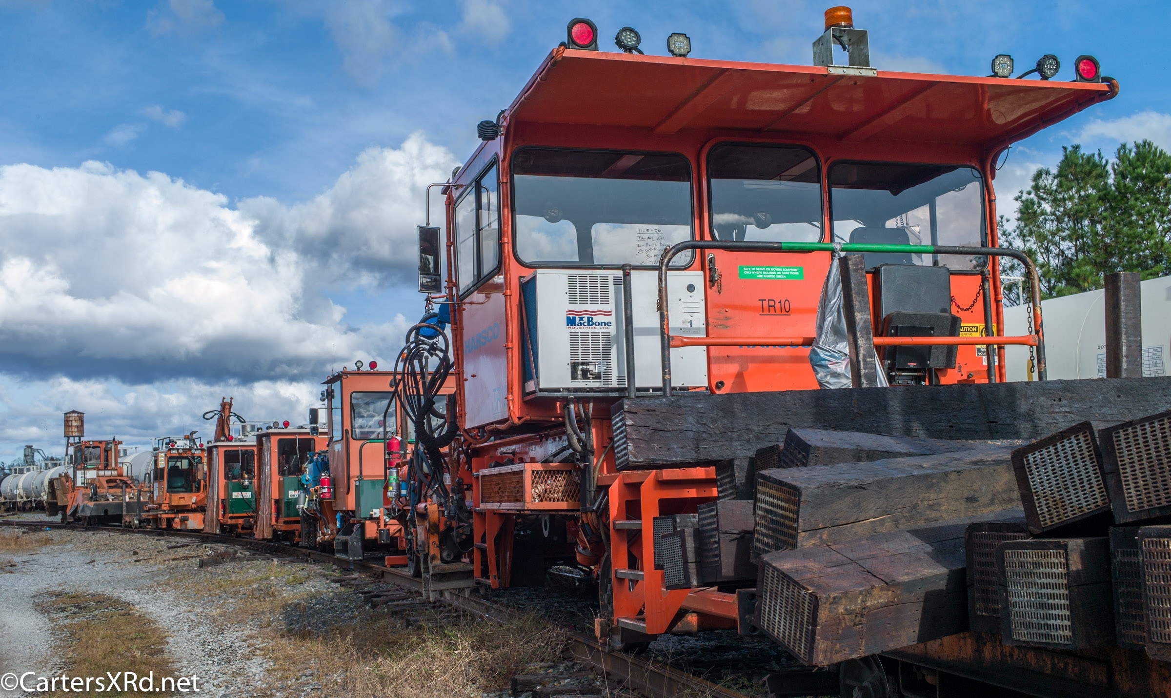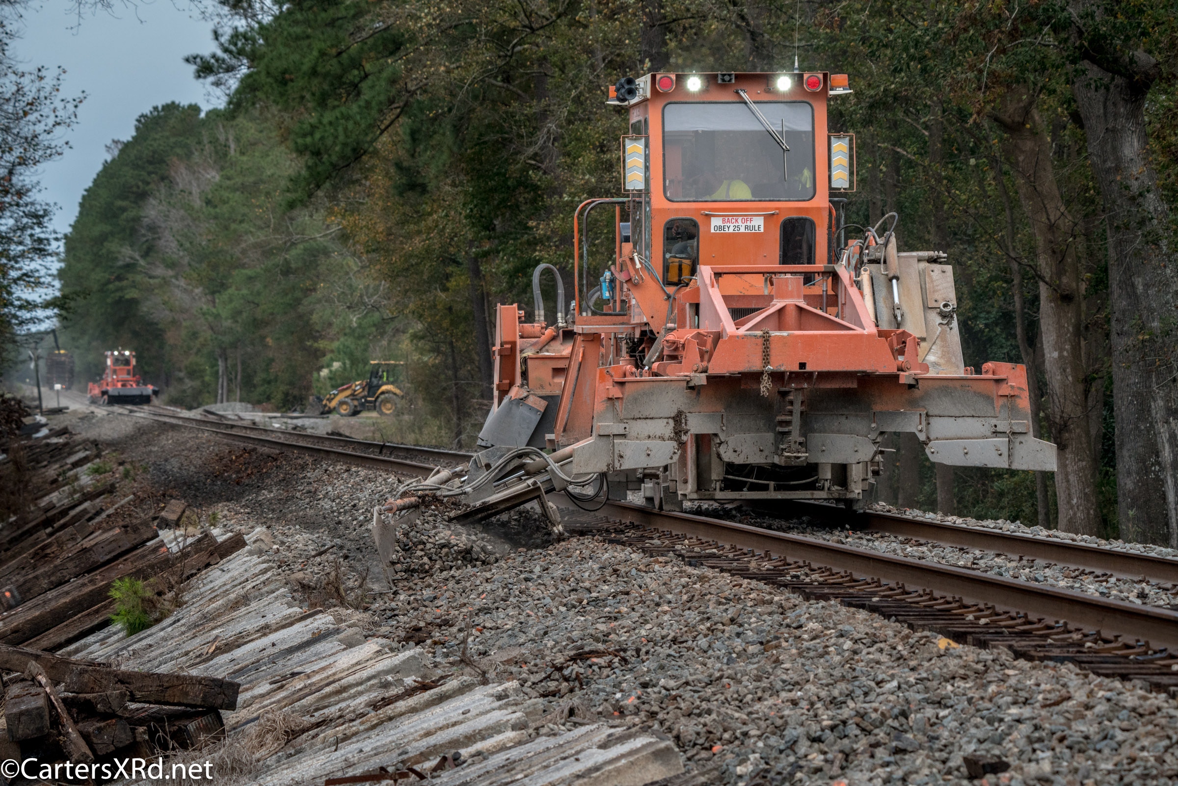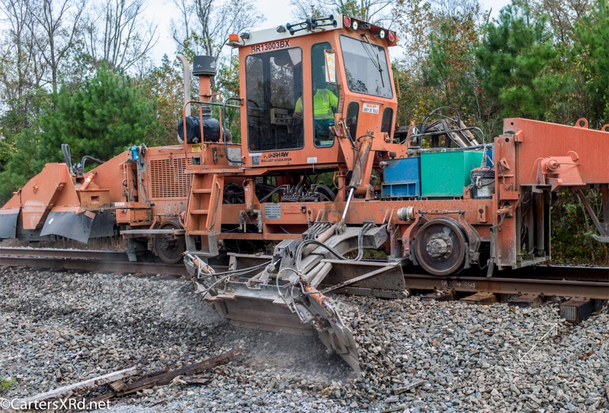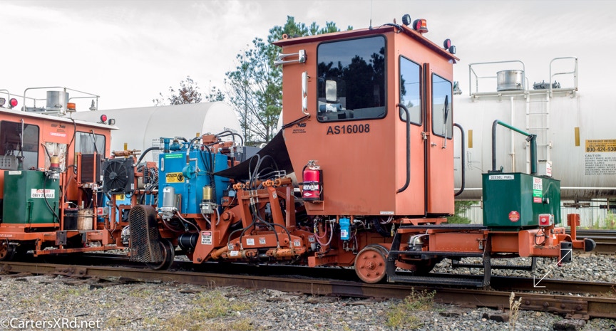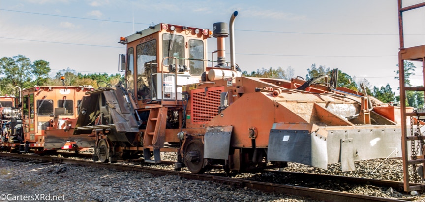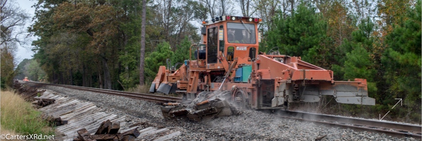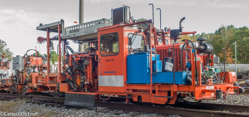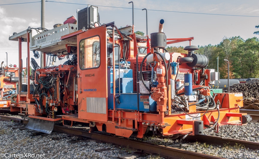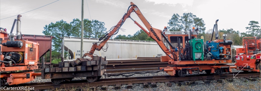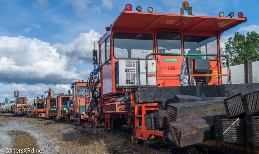 Ties were replaced on the Chocowinity-Aurora line. The rails were replaced a year ago, and it was time to finish replacing the cross ties and surface all the crossings. Norfolk Southern’s Ties & Surfacing Gang #8 working and tied down in the yard November 8-14