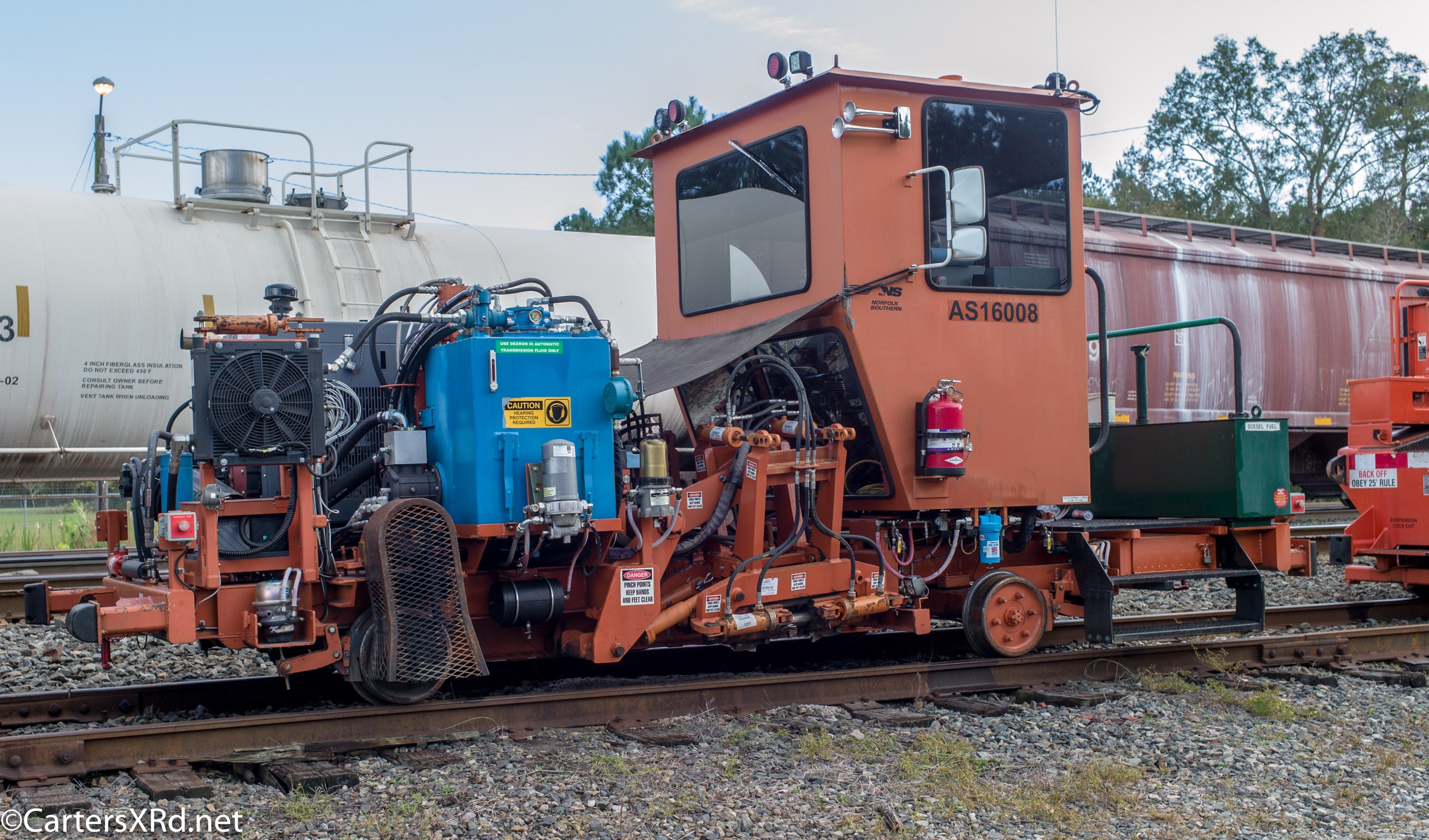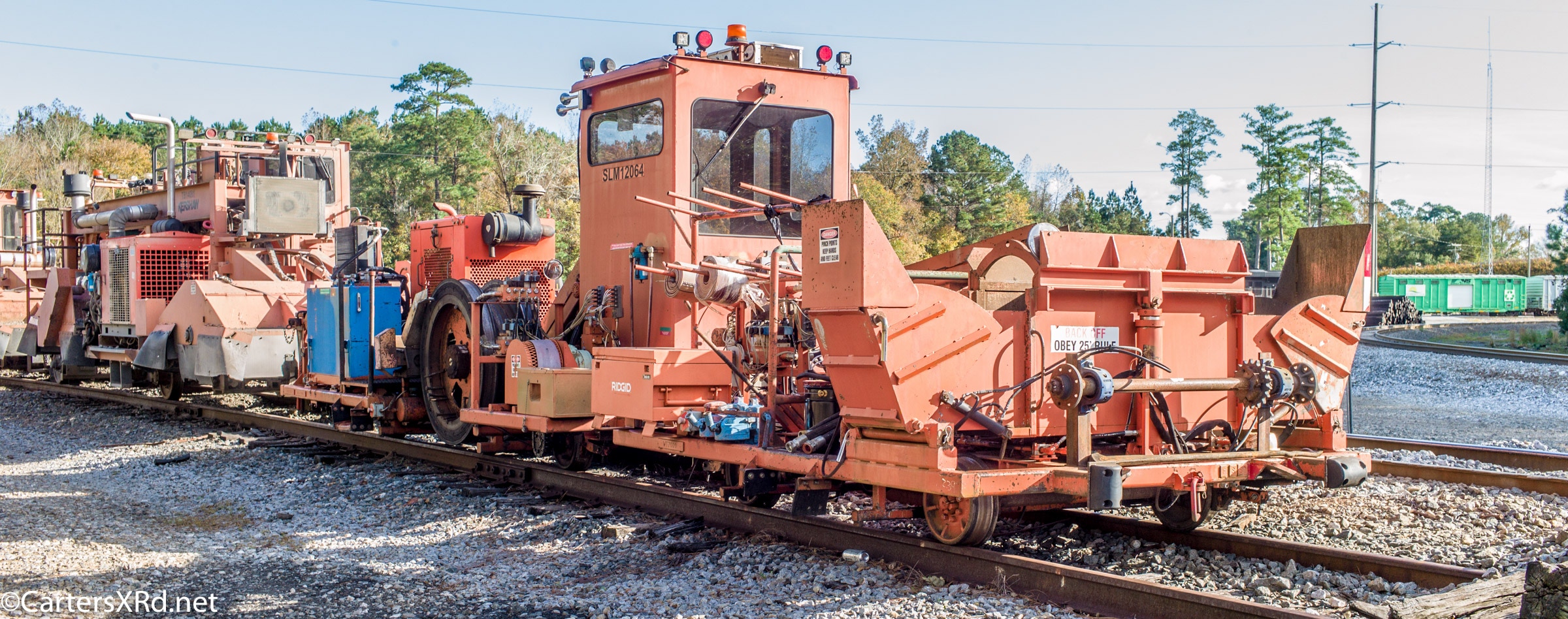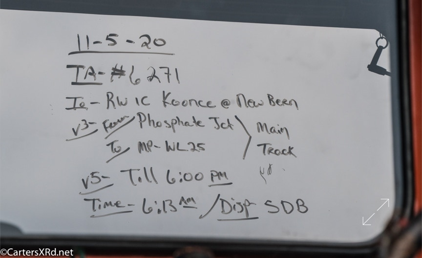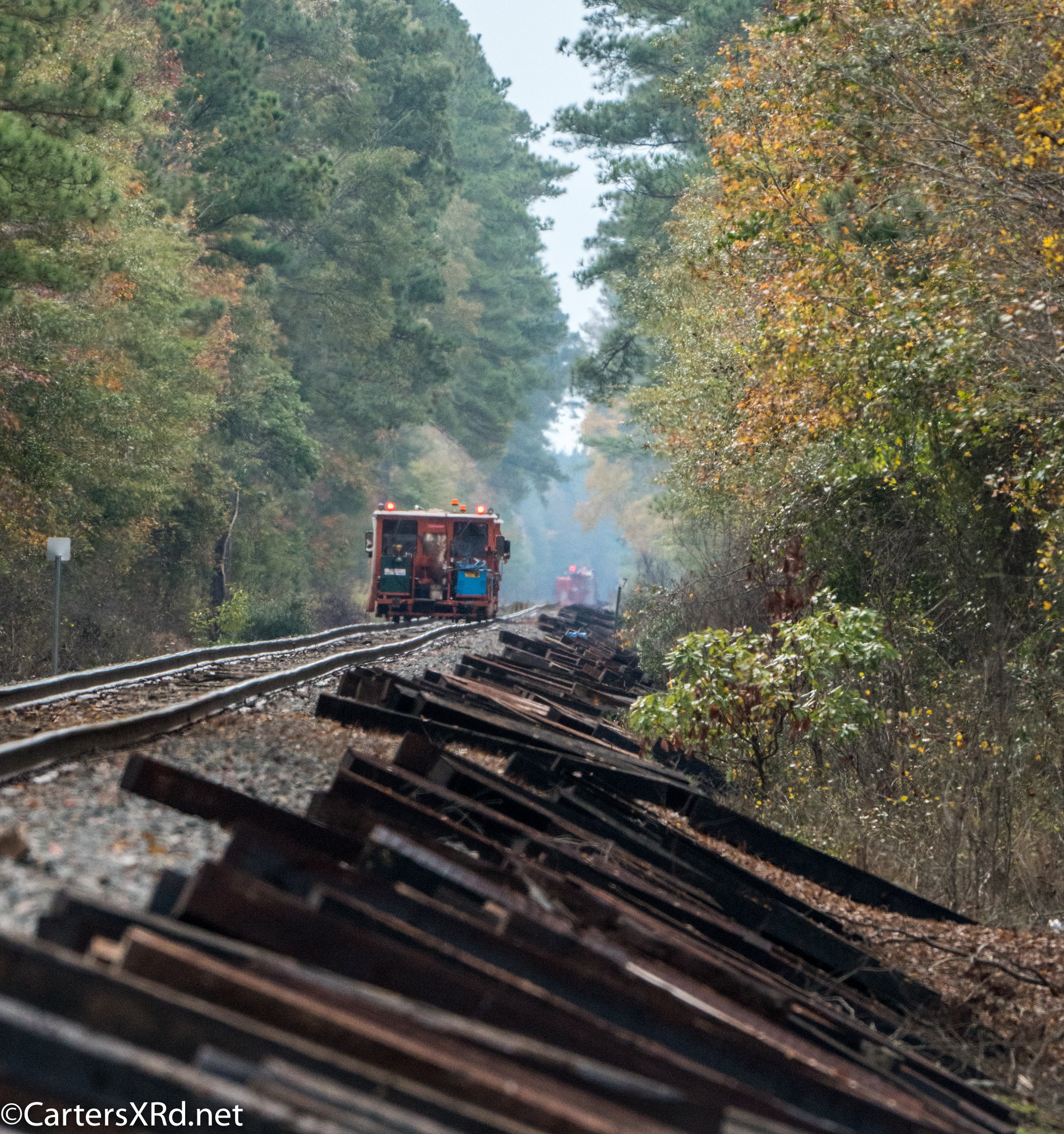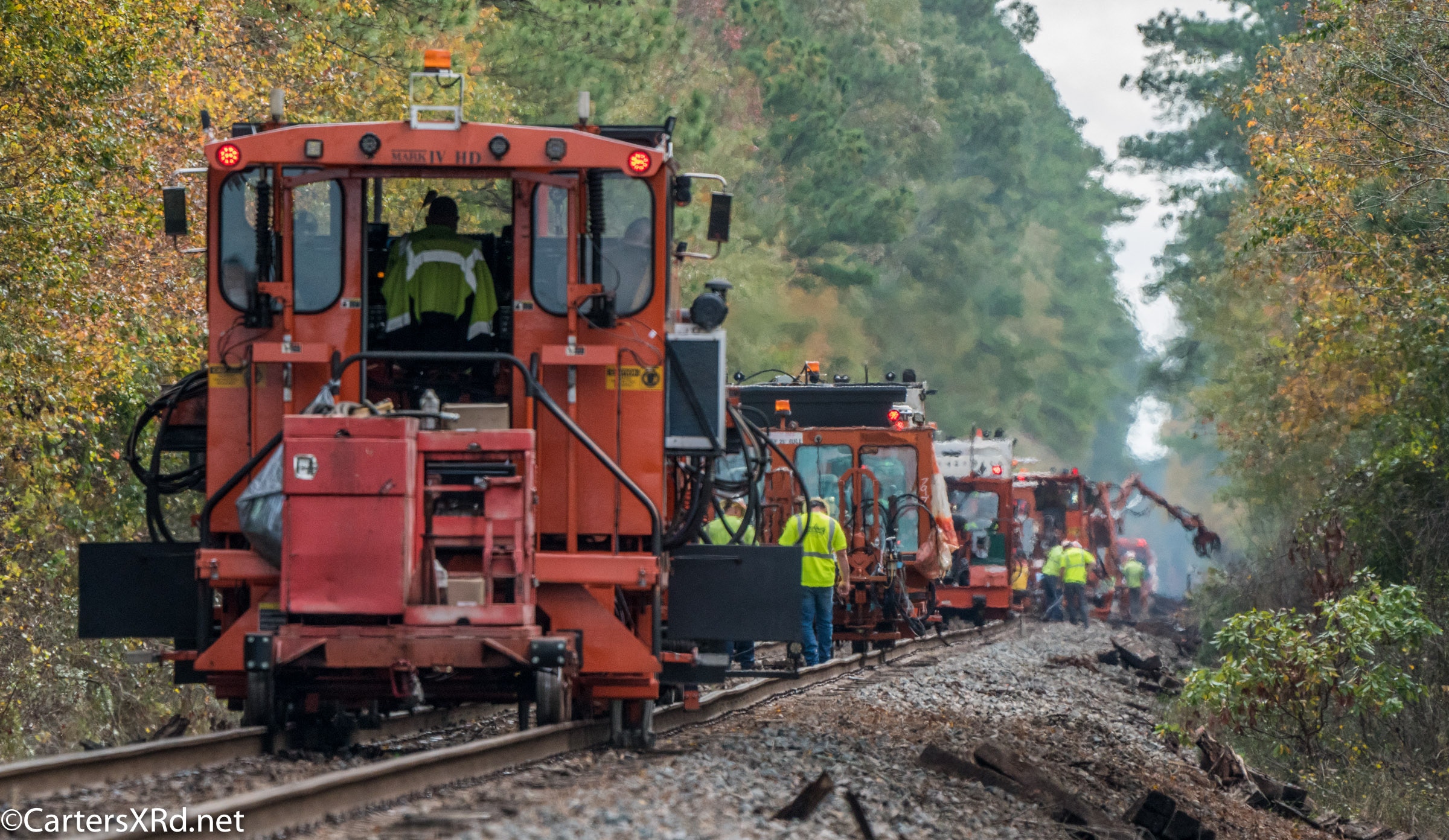 Ties were replaced on the Chocowinity-Aurora line. The rails were replaced a year ago, and it was time to finish replacing the cross ties and surface all the crossings. Norfolk Southern’s Ties & Surfacing Gang #8 working and tied down in the yard November 8-14