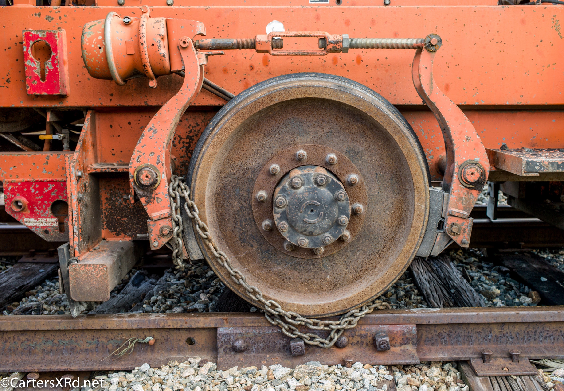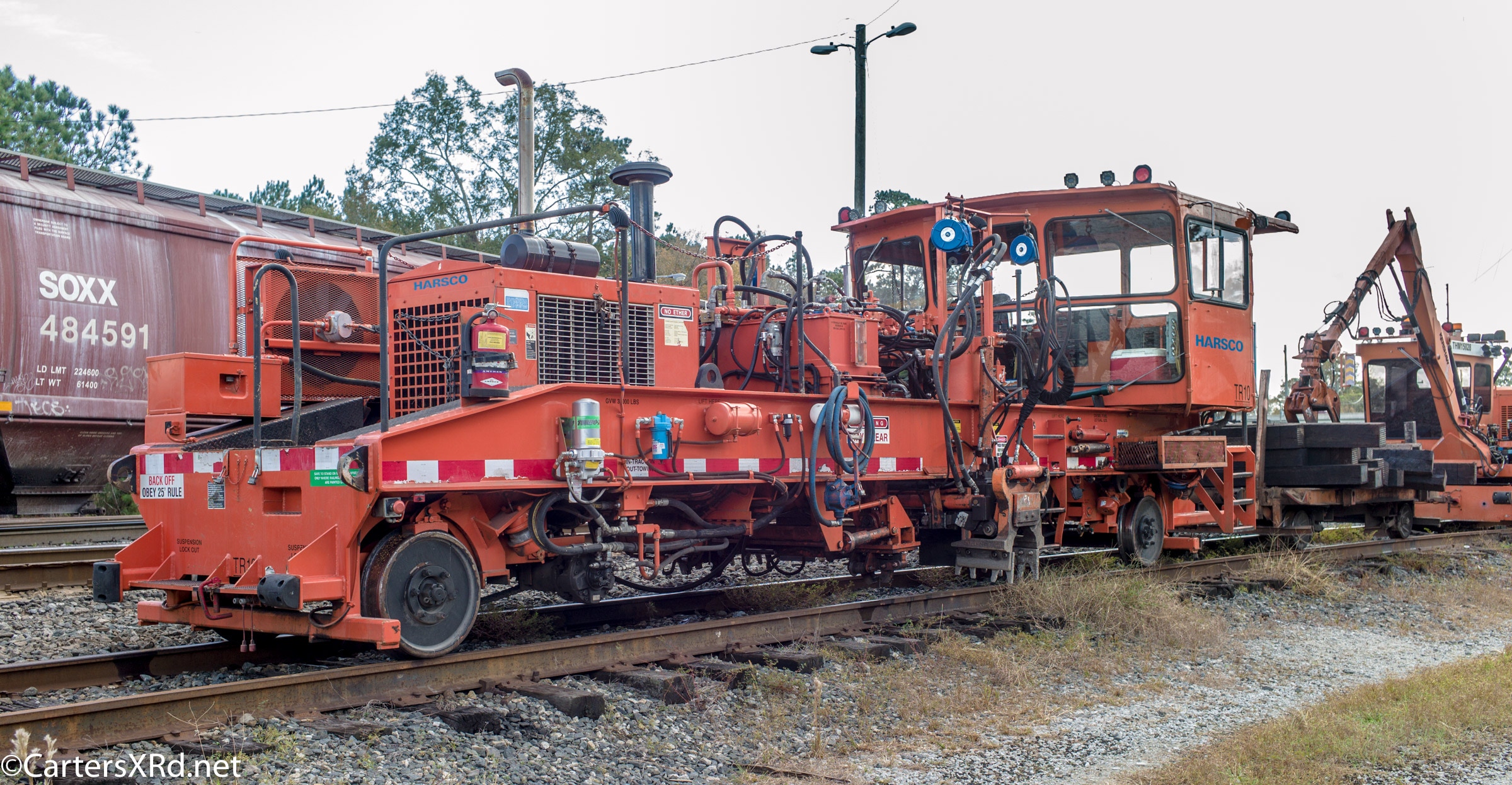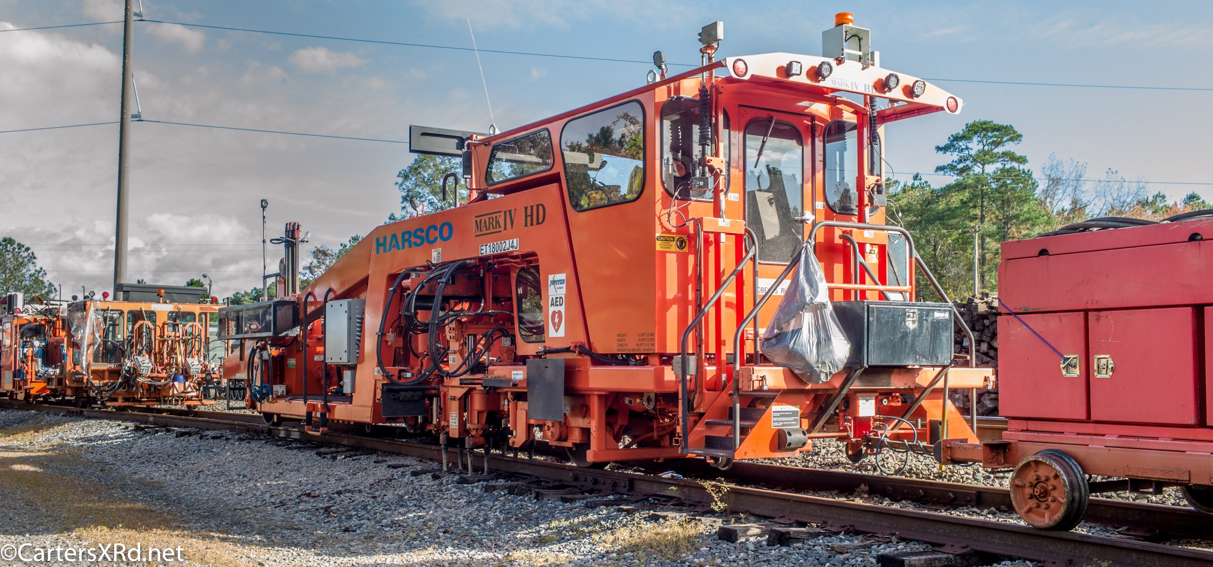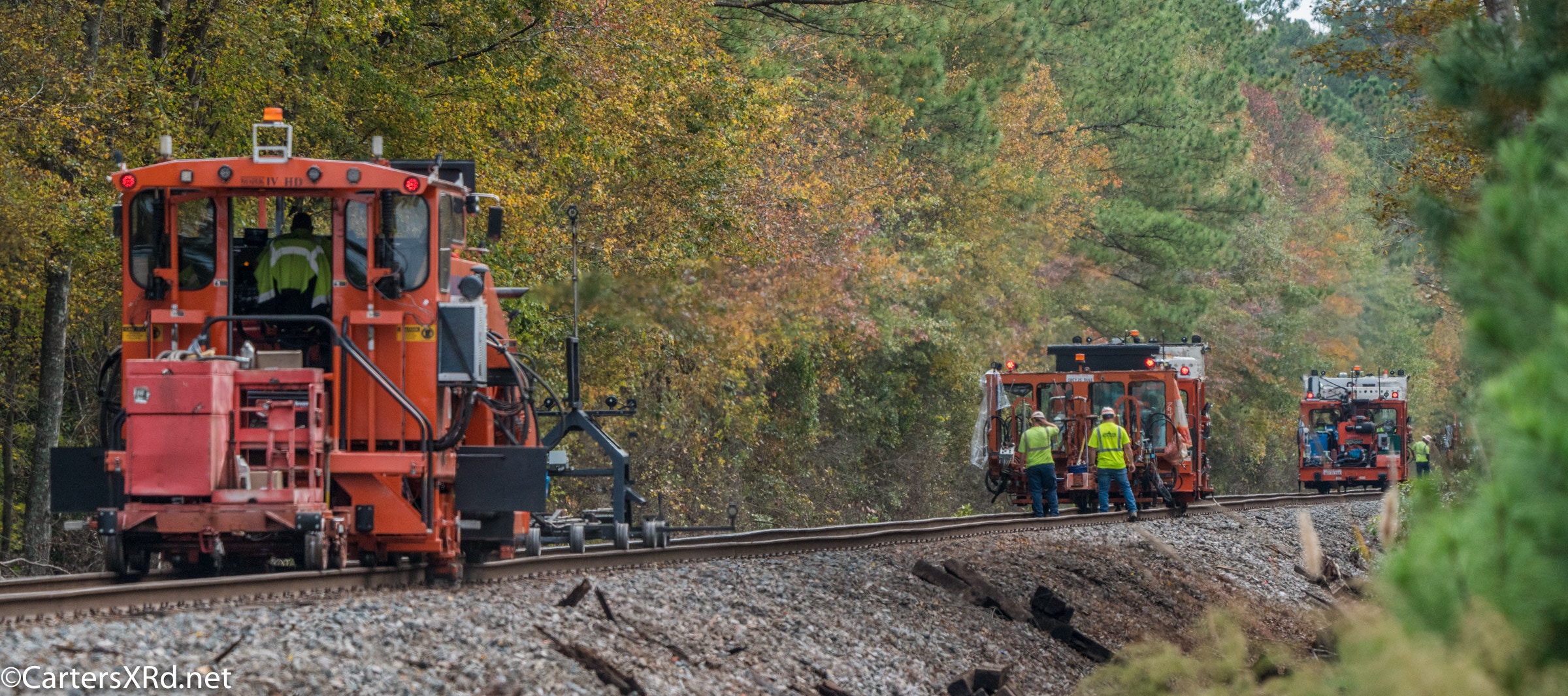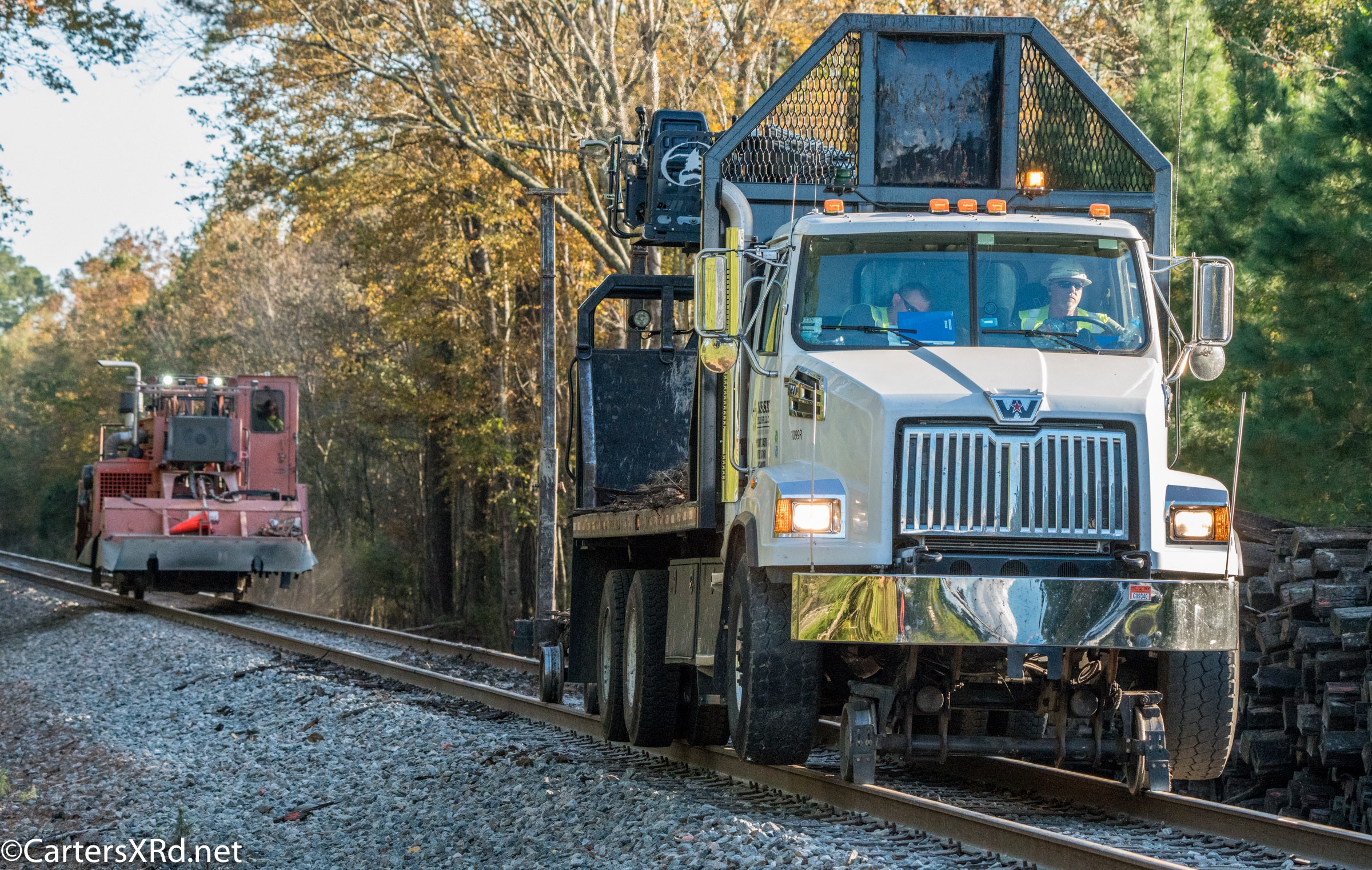 Ties were replaced on the Chocowinity-Aurora line. The rails were replaced a year ago, and it was time to finish replacing the cross ties and surface all the crossings. Norfolk Southern’s Ties & Surfacing Gang #8 working and tied down in the yard November 8-14