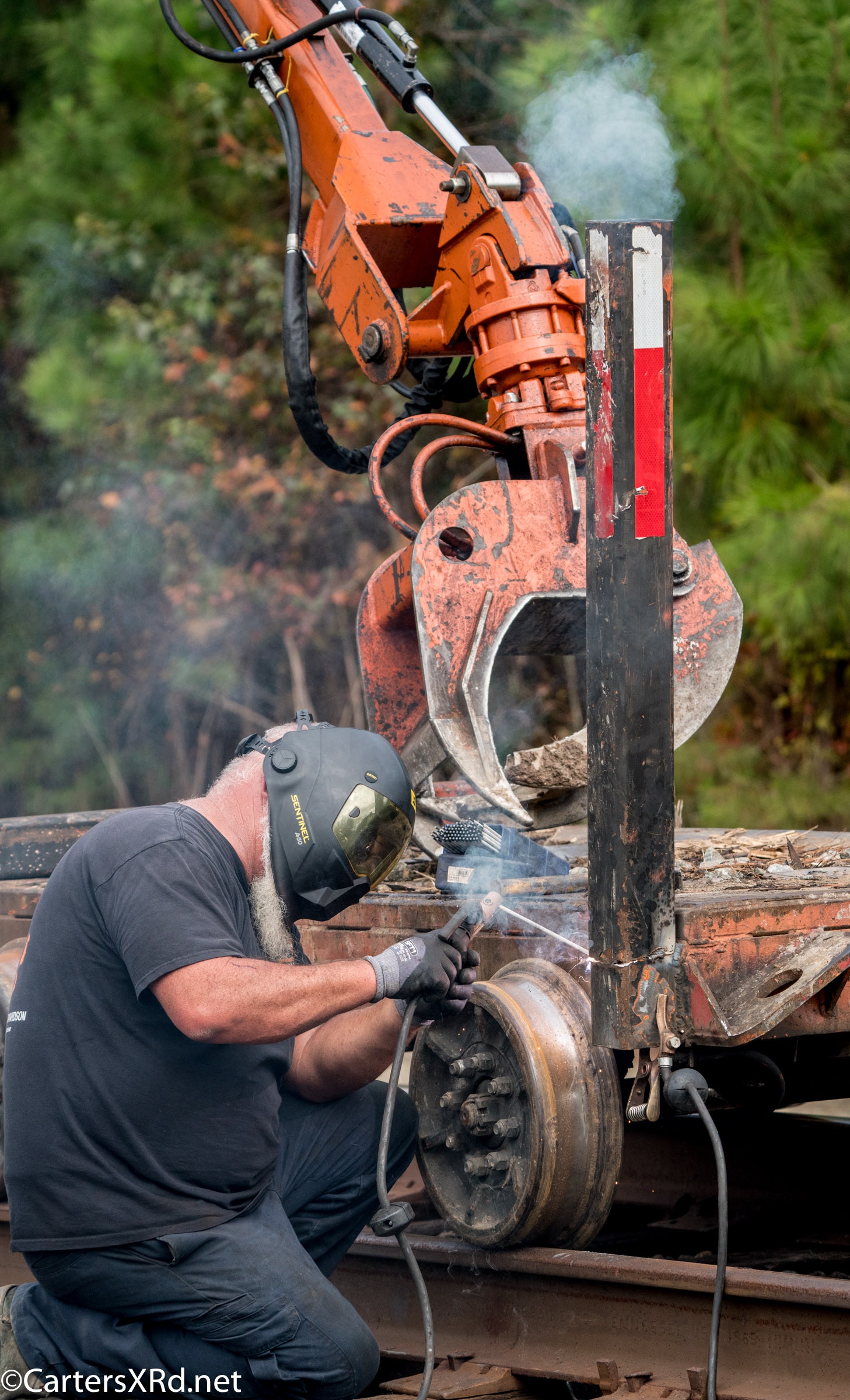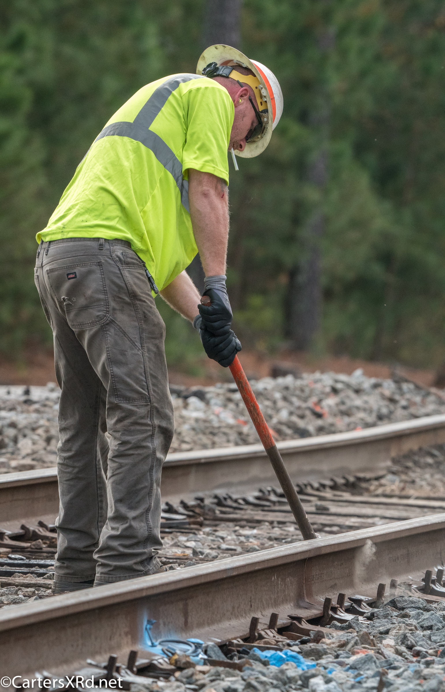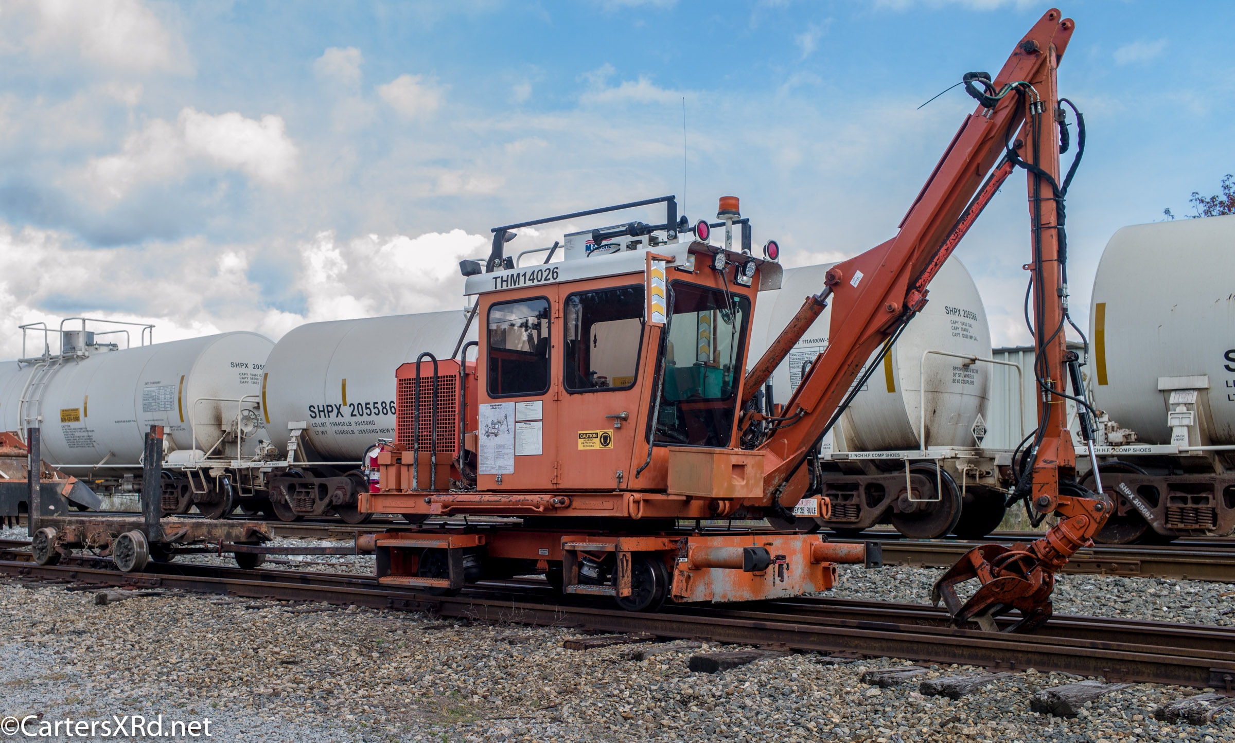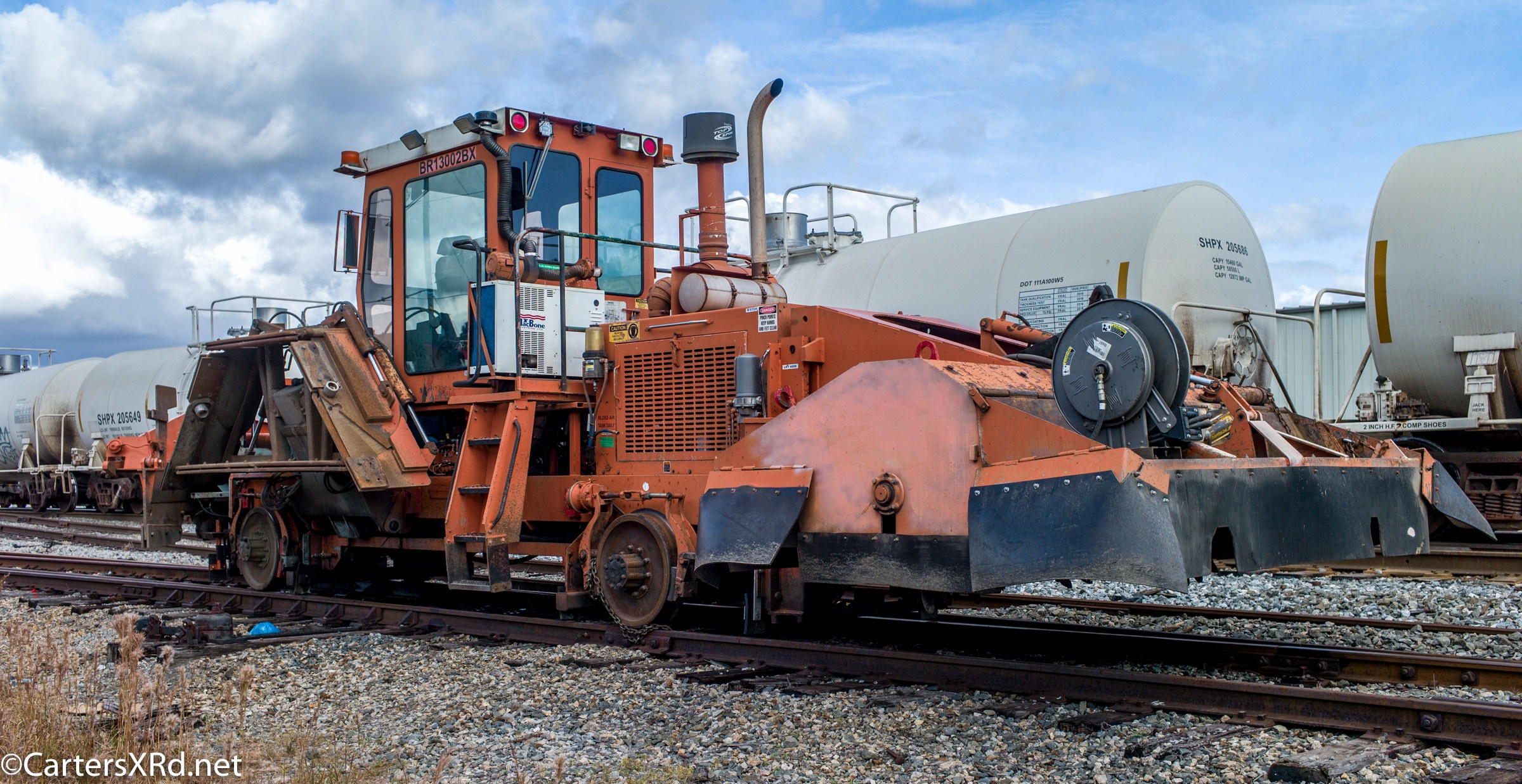 Ties were replaced on the Chocowinity-Aurora line. The rails were replaced a year ago, and it was time to finish replacing the cross ties and surface all the crossings. Norfolk Southern’s Ties & Surfacing Gang #8 working and tied down in the yard November 8-14
