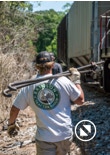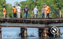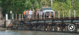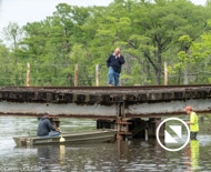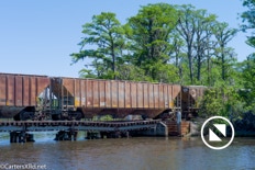On April 22, the rail trestle across Runyan Creek between Washington Park and Washington NC failed. It was a close call for the locomotive and crew as the south track fell by a foot or more. The Carolina Coastal Railway engineer did a great job of stopping the train and getting a car astraddle the broken span. to minimize the weight on the bad section. Here are a couple of dozen stills and a video of the event clean-up.