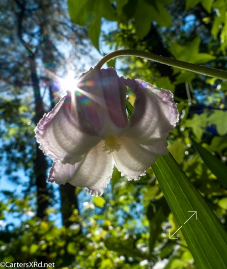 This bell-shaped beauties grow on a perennial vine and are in the Clematis family. They are in the woods near our house, and I photographed this bloom as it eclipsed the sun one morning.