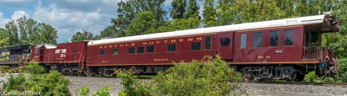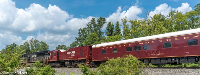 The Brick is a Norfolk Southern geometry train. Research Unit 33 and 34 contain instrumentation to track and record any track defects and their exact position. It made a run from Selma to Morehead City on September 3. Is is seen here on its return trip through New Bern. The track they ran is now being renewed.