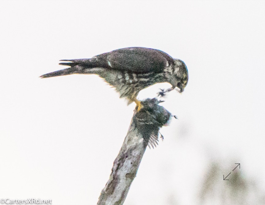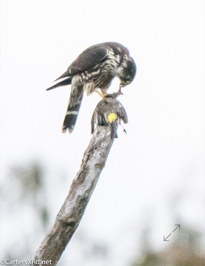This merlin grabbed a yellow-rumped warbler over the creek on October 30. Kitty saw him veer of his path to grab the startled warbler. It was one of our more uncommon visitors thinning the numbers of one of our most common winter visitors. He was NOT wasteful.