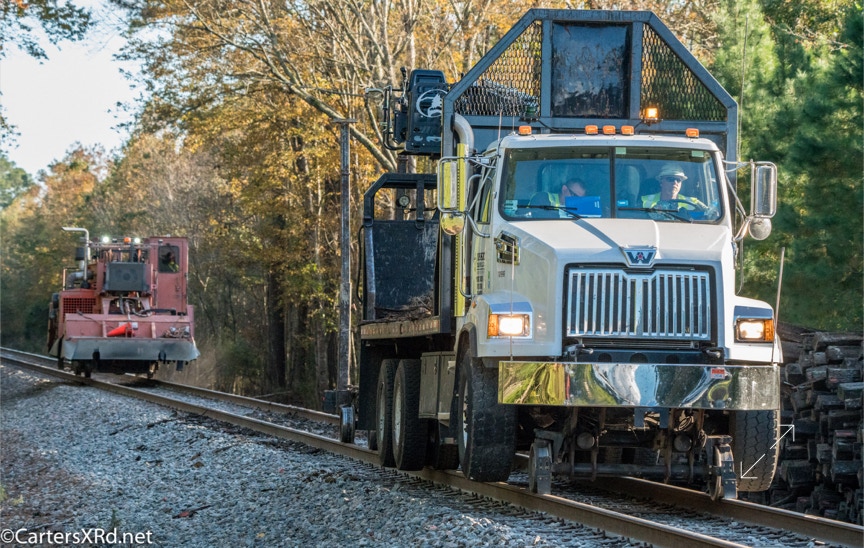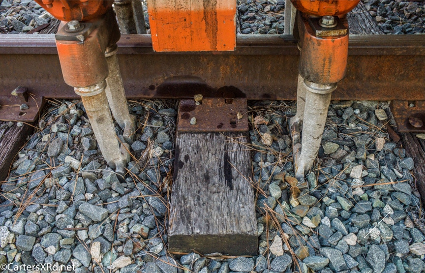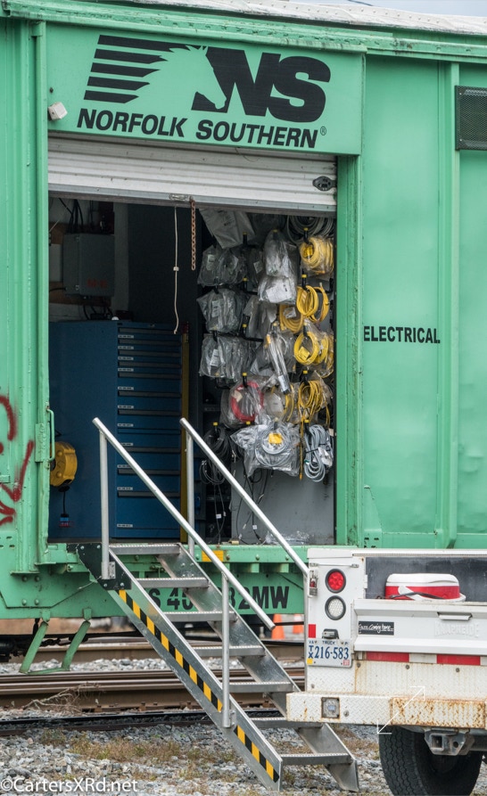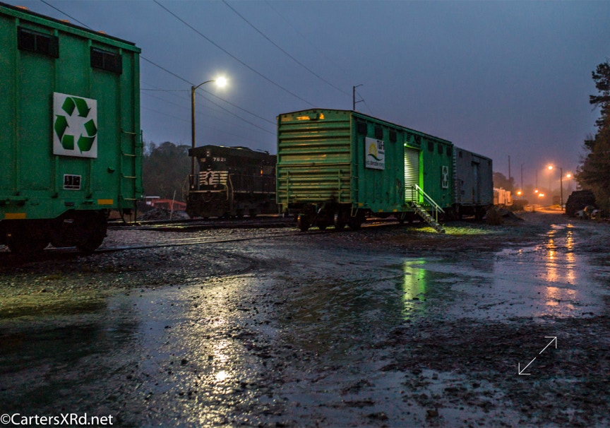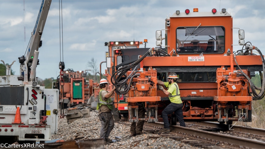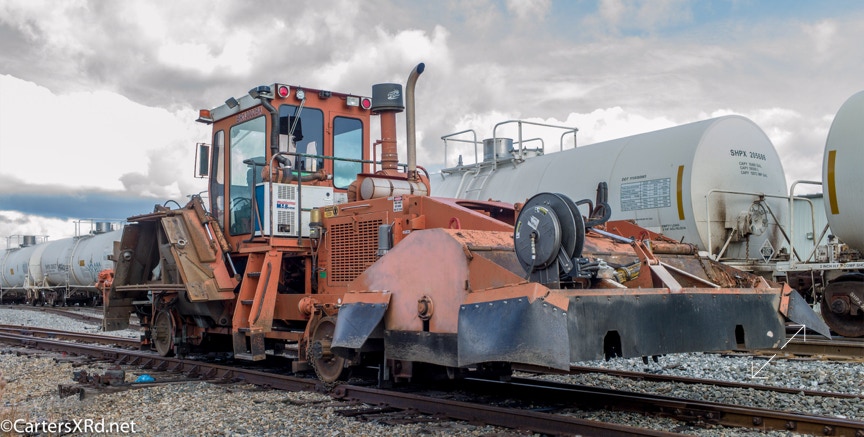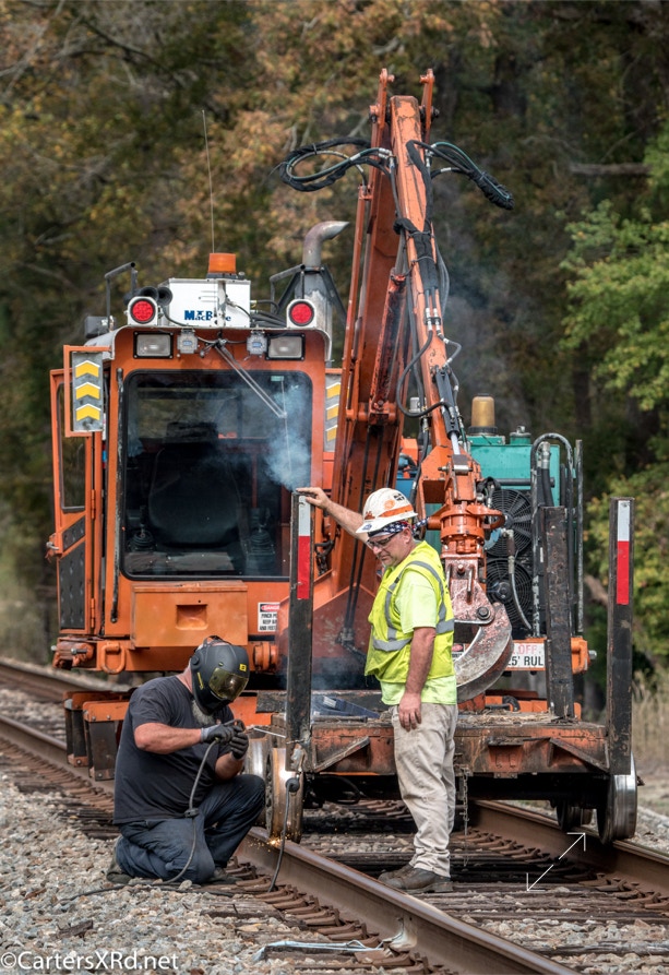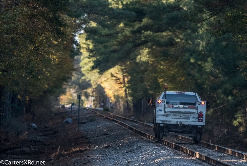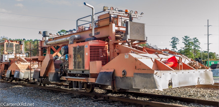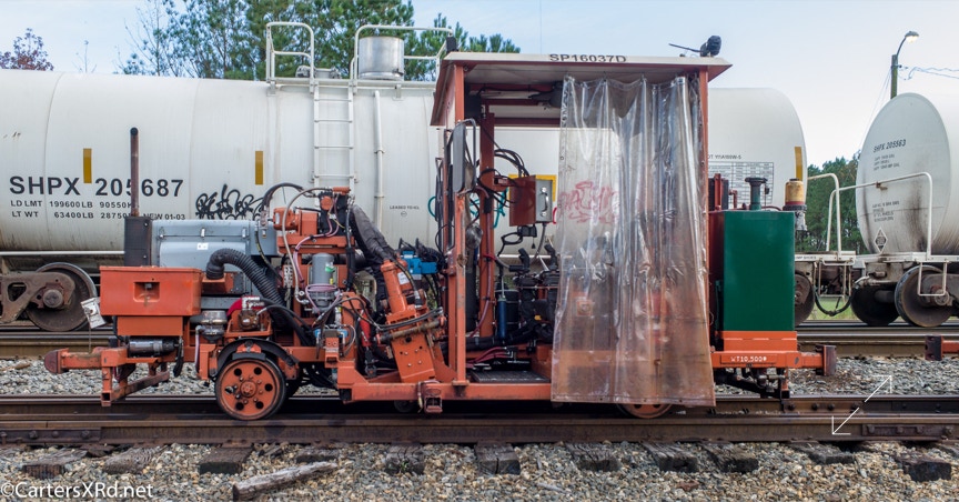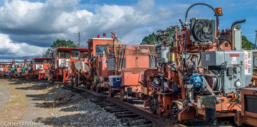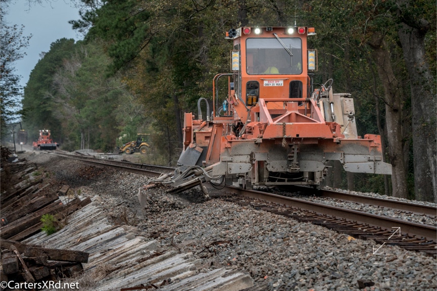 Ties were replaced on the Chocowinity-Aurora line. The rails were replaced a year ago, and it was time to finish replacing the cross ties and surface all the crossings. Norfolk Southern’s Ties & Surfacing Gang #8 working and tied down in the yard November 8-14